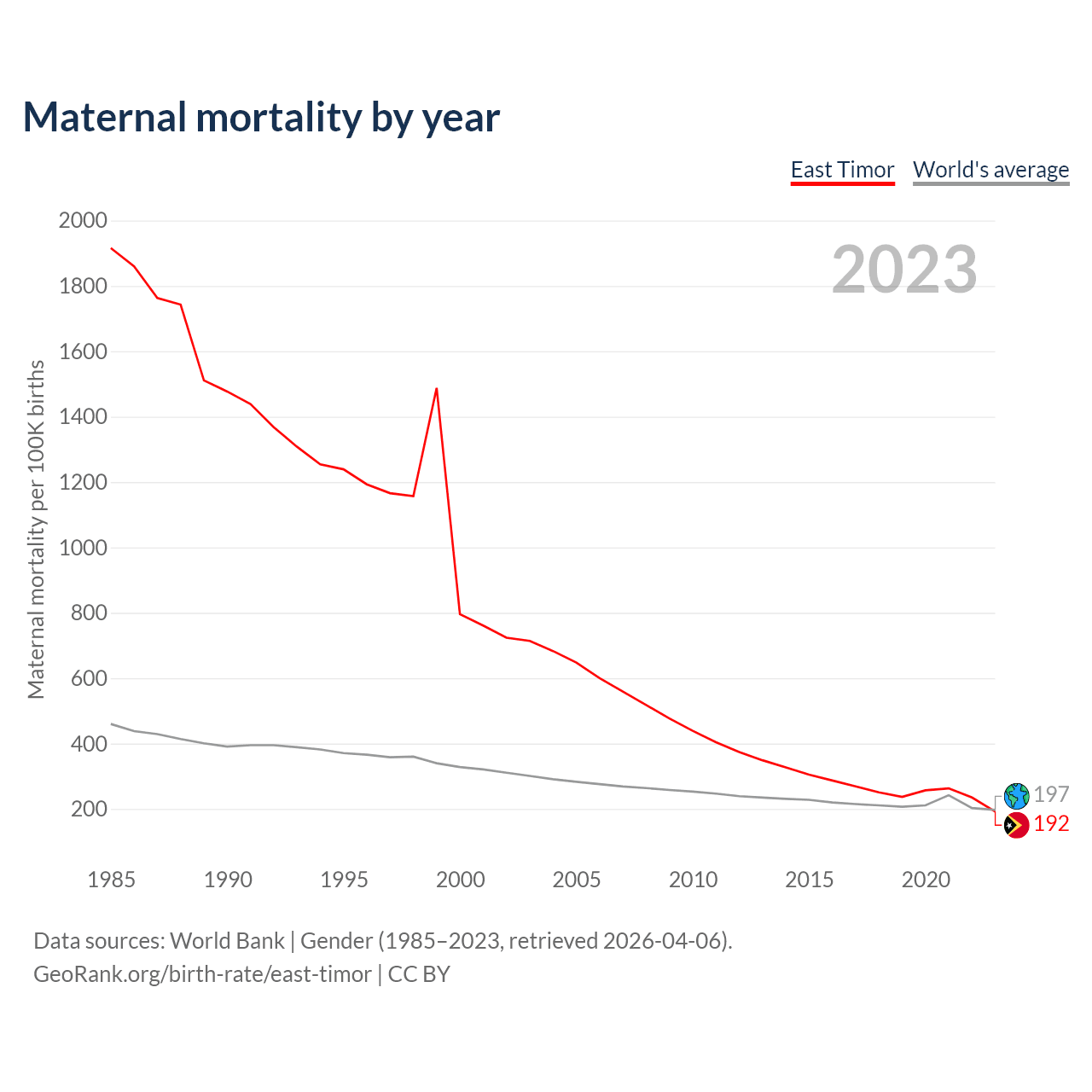 The maternal mortality rate in East Timor was 192 deaths per 100,000 live births in 2023 — a 0.19% chance of dying during childbirth or within 42 days of pregnancy termination. This is a 75.9% decrease compared to the year 2000.