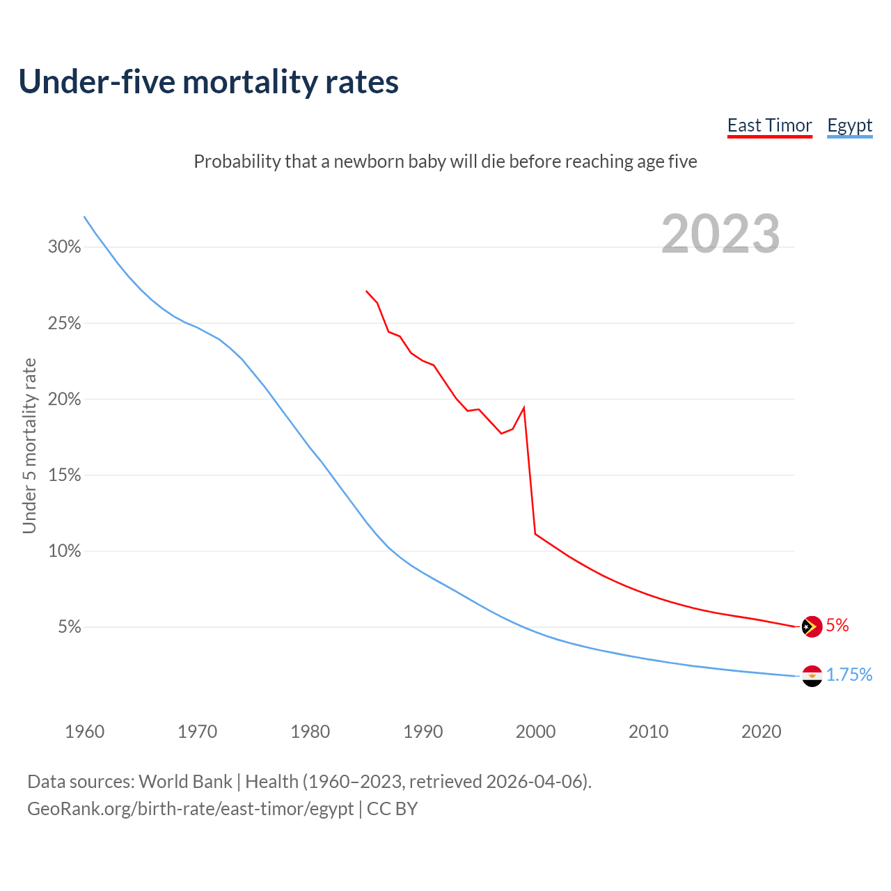 The chance that a newborn baby will die before reaching age five is 5% in East Timor and 1.75% in Egypt. Above is a chart with historical data on under-five mortality rates.