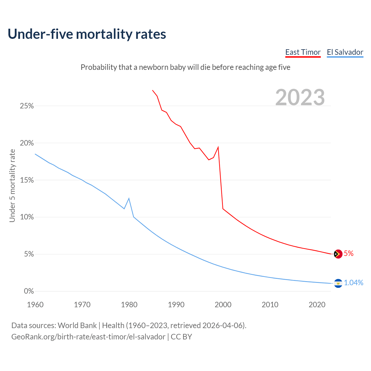 The chance that a newborn baby will die before reaching age five is 5% in East Timor and 1.04% in El Salvador. Above is a chart with historical data on under-five mortality rates.