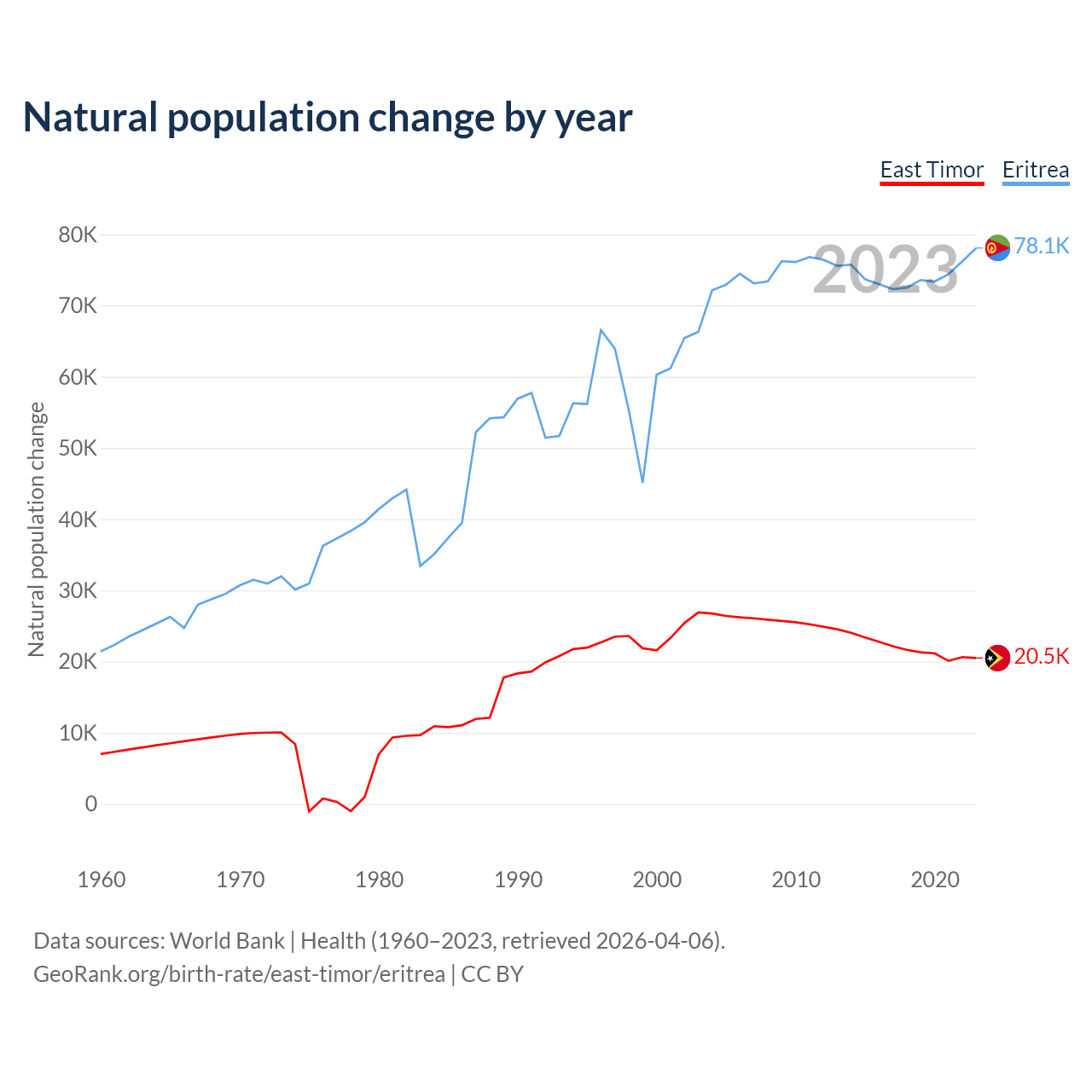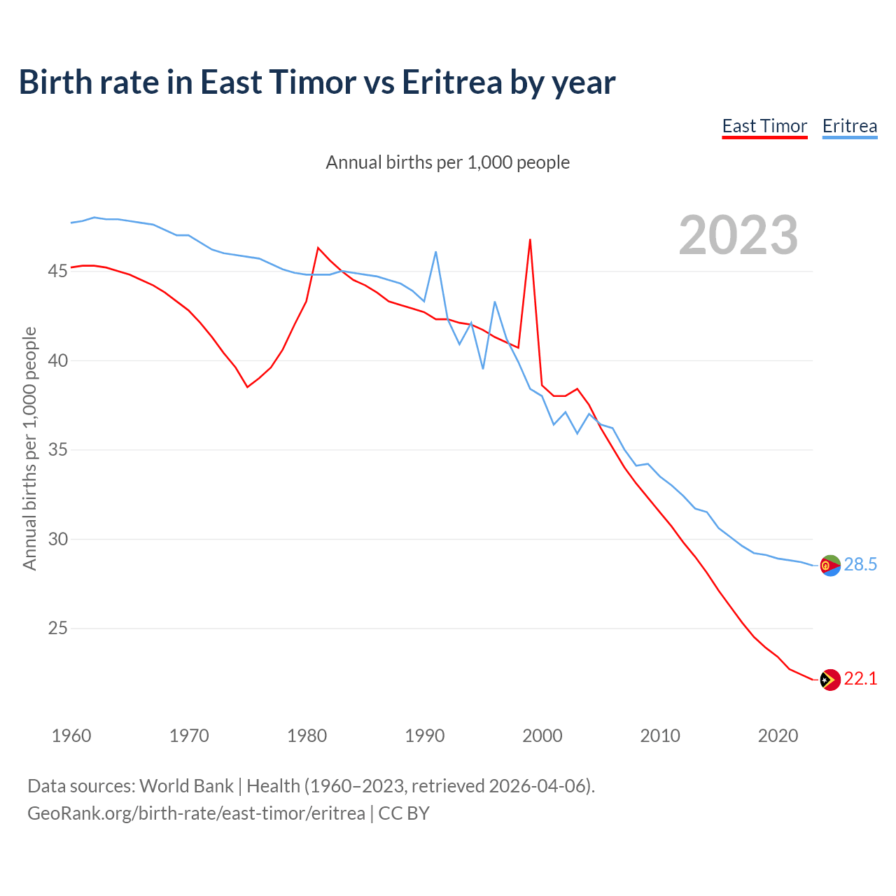 East Timor has an annual birth rate of 22.1 births per 1,000 people, compared to 28.5 for Eritrea. The average number of children a woman is expected to have during her lifetime — the fertility rate, is 2.71 in East Timor and 3.71 in Eritrea — 37.2% difference.