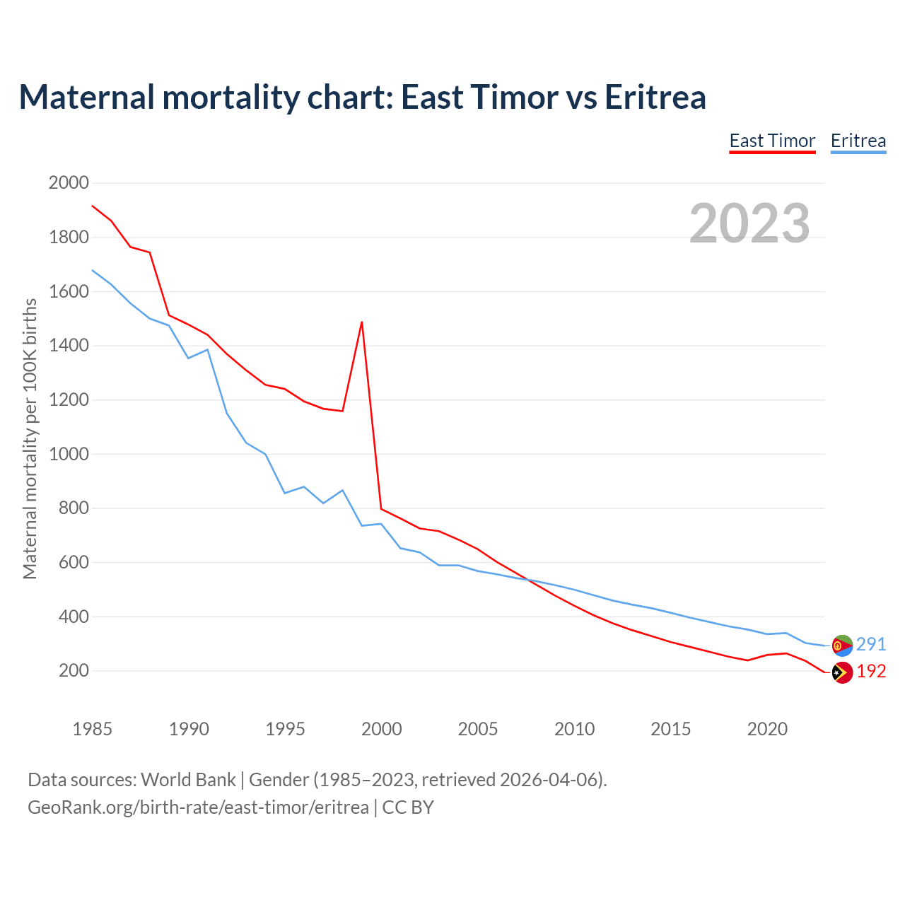 The maternal mortality rate, which is the probability of dying during childbirth or within 42 days of pregnancy termination, is 192 deaths per 100,000 live births in East Timor, compared to 291 deaths in Eritrea.