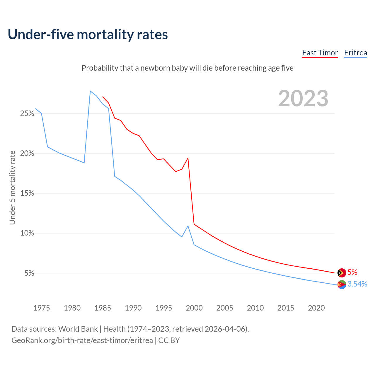 The chance that a newborn baby will die before reaching age five is 5% in East Timor and 3.54% in Eritrea. Above is a chart with historical data on under-five mortality rates.