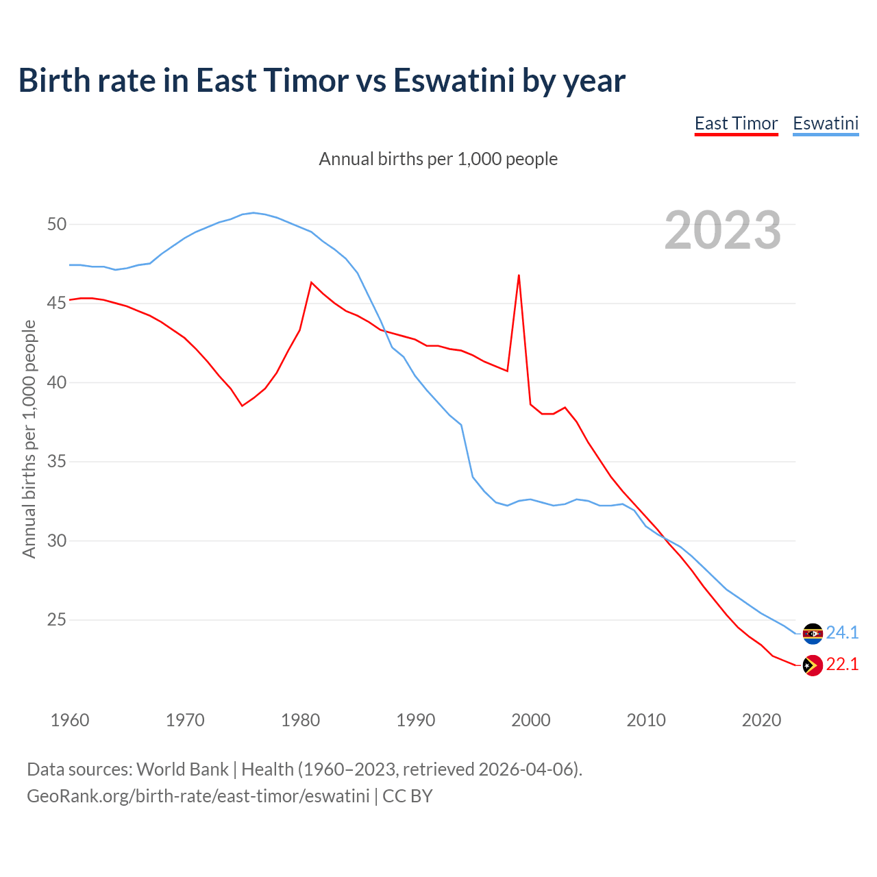- East Timor is ranked 62/196 by birth rate compared to 57/196 for Eswatini.