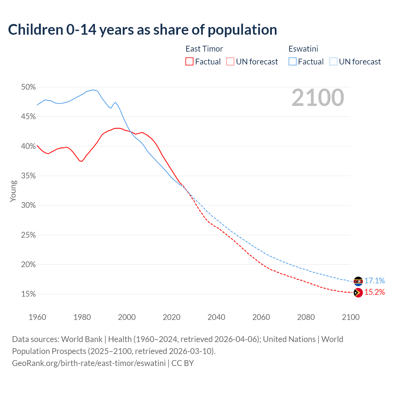 According to the latest available data on birth rates, the fertility rate in East Timor was 2.71 children per woman in 2023, compared to 2.75 in Eswatini in 2023. The replacement level is considered to be 2.1 children per woman.