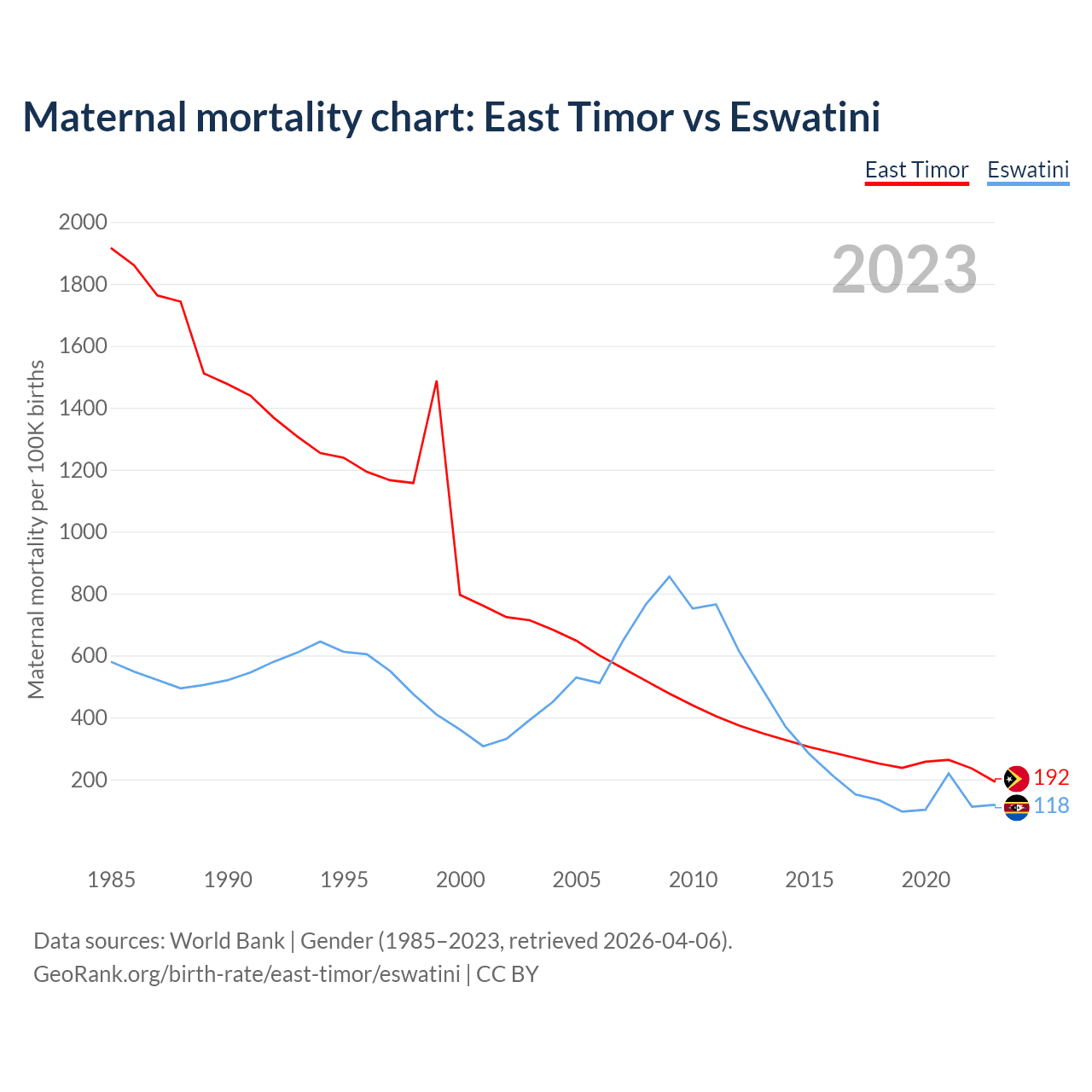 The maternal mortality rate, which is the probability of dying during childbirth or within 42 days of pregnancy termination, is 192 deaths per 100,000 live births in East Timor, compared to 118 deaths in Eswatini.