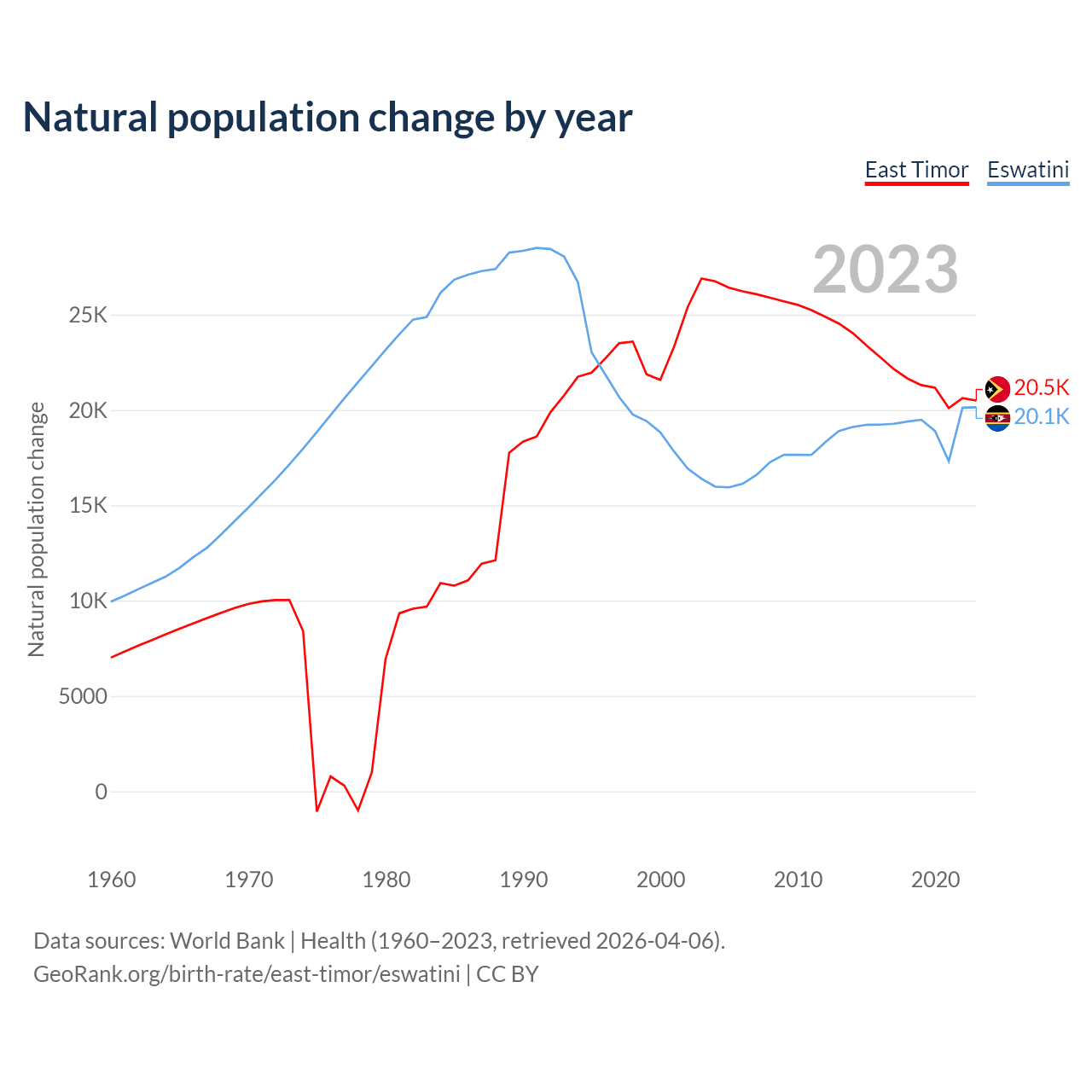 East Timor has an annual birth rate of 22.1 births per 1,000 people, compared to 24.1 for Eswatini. The average number of children a woman is expected to have during her lifetime — the fertility rate, is 2.71 in East Timor and 2.75 in Eswatini — 1.7% difference.