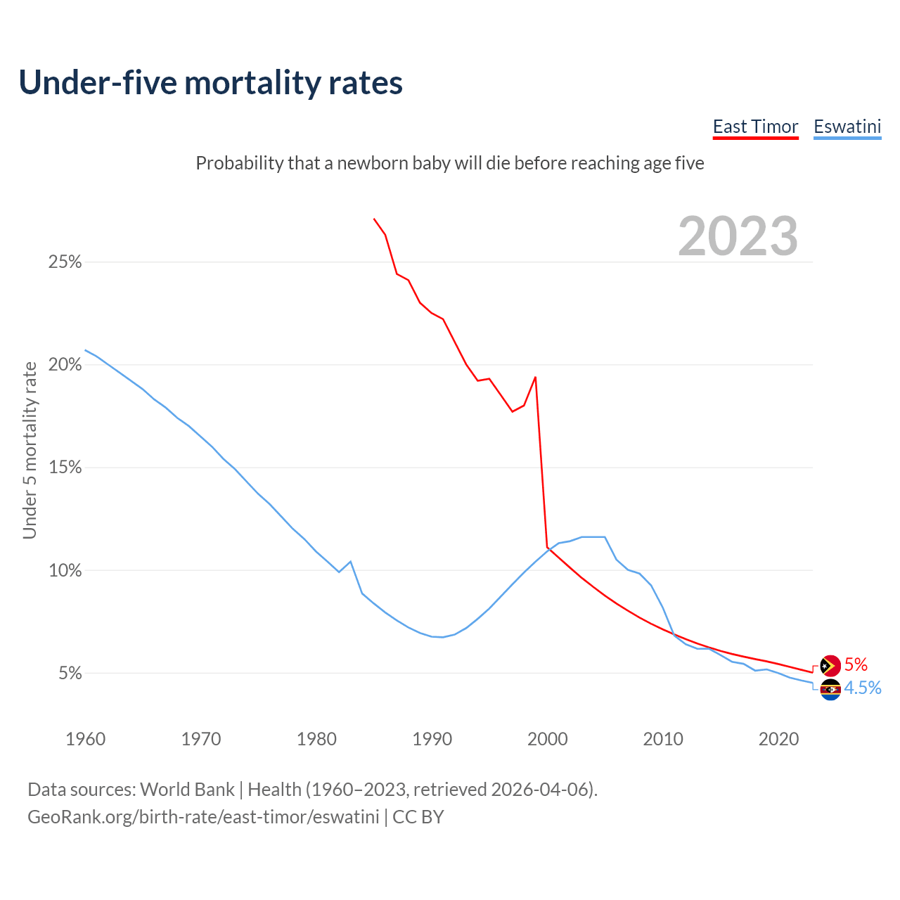 The chance that a newborn baby will die before reaching age five is 5% in East Timor and 4.5% in Eswatini. Above is a chart with historical data on under-five mortality rates.