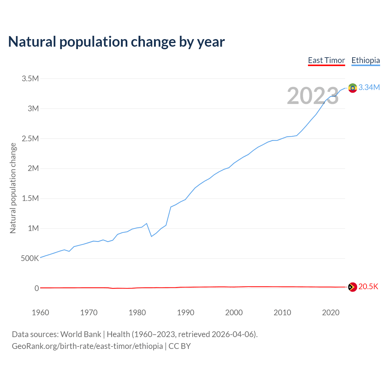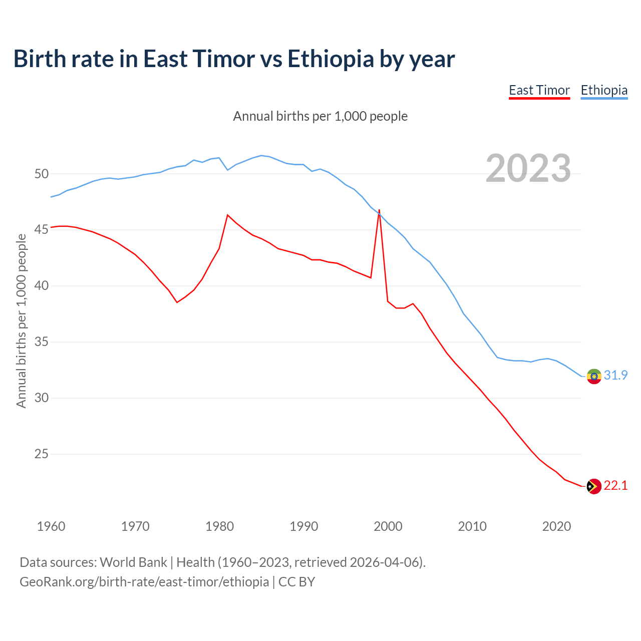 East Timor has an annual birth rate of 22.1 births per 1,000 people, compared to 31.9 for Ethiopia. The average number of children a woman is expected to have during her lifetime — the fertility rate, is 2.71 in East Timor and 3.99 in Ethiopia — 47.4% difference.
