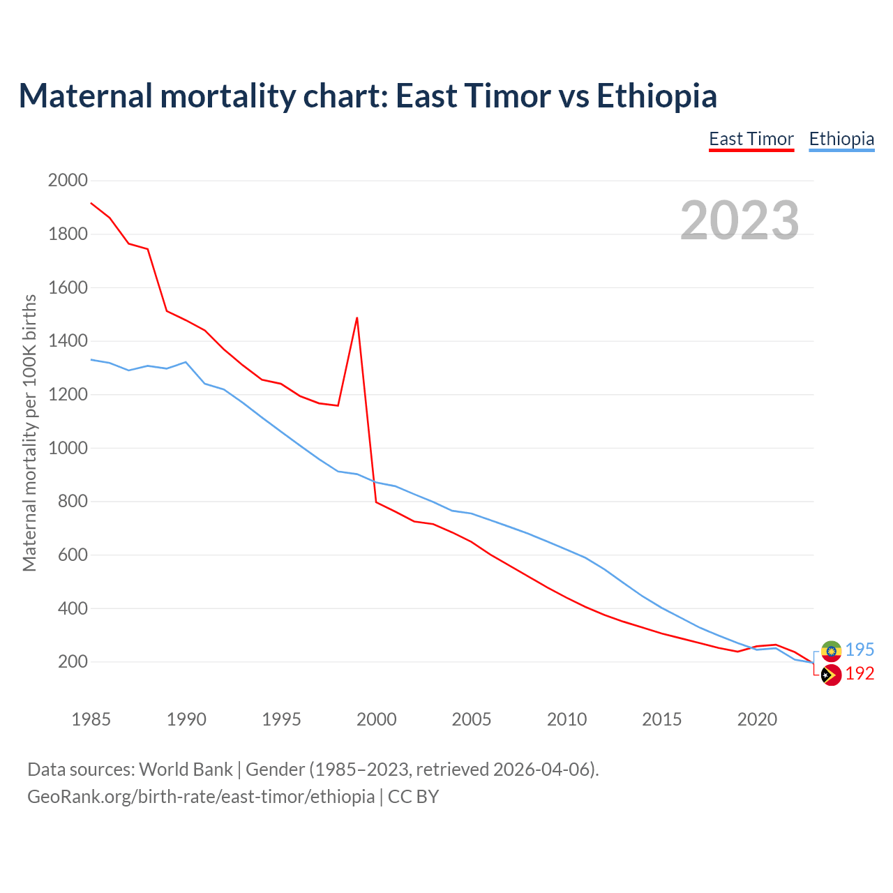 The maternal mortality rate, which is the probability of dying during childbirth or within 42 days of pregnancy termination, is 192 deaths per 100,000 live births in East Timor, compared to 195 deaths in Ethiopia.