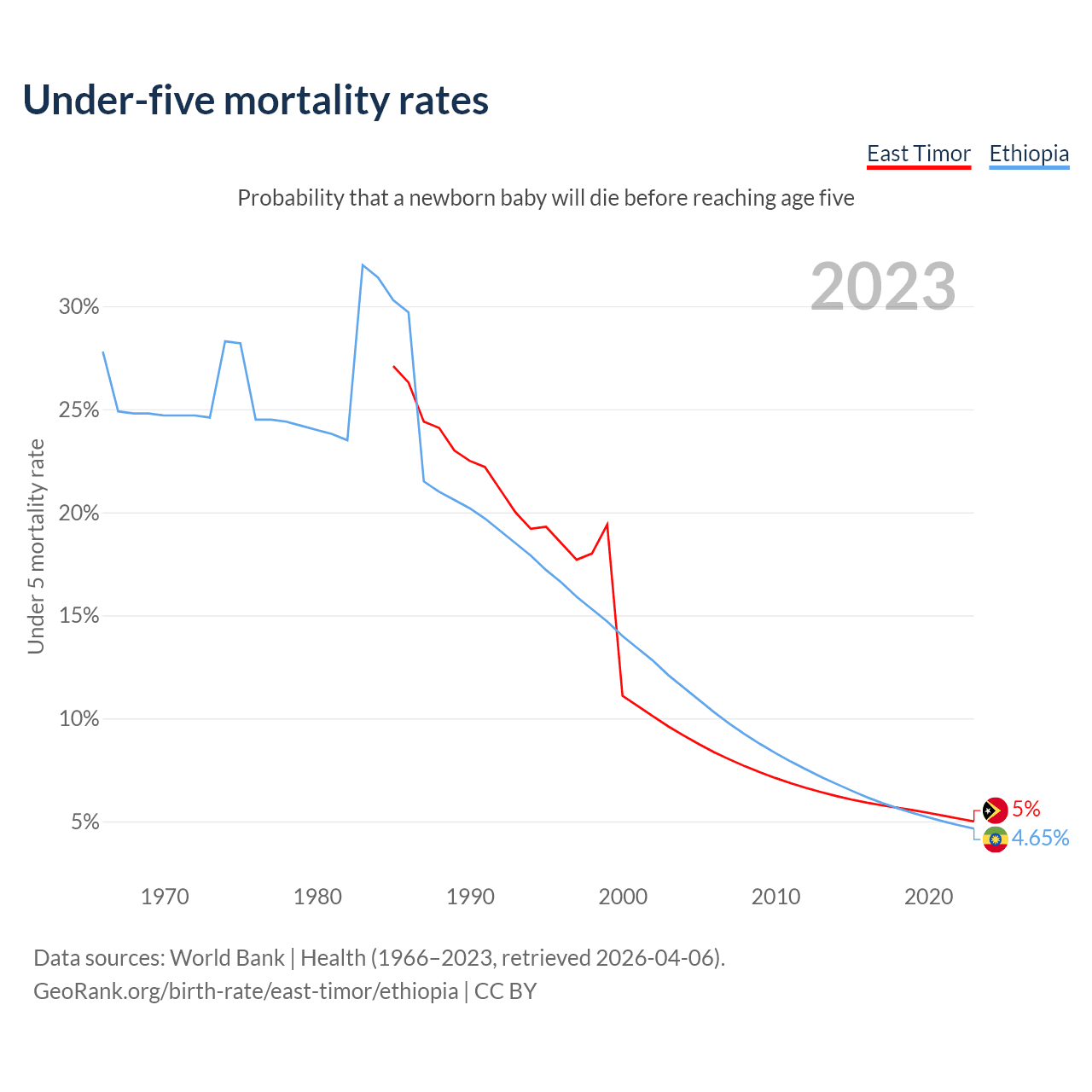 The chance that a newborn baby will die before reaching age five is 5% in East Timor and 4.65% in Ethiopia. Above is a chart with historical data on under-five mortality rates.