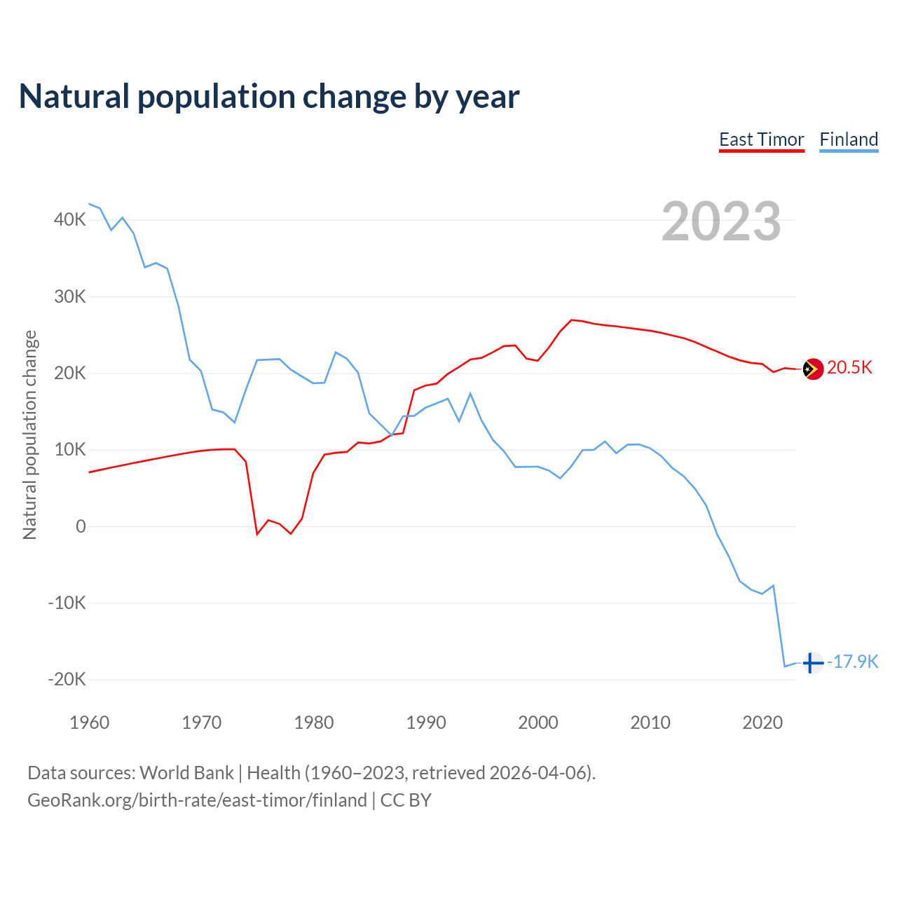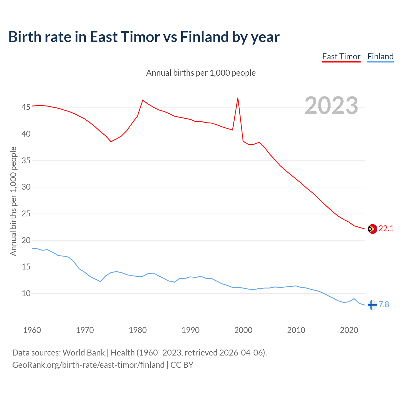 East Timor has an annual birth rate of 22.1 births per 1,000 people, compared to 7.8 for Finland. The average number of children a woman is expected to have during her lifetime — the fertility rate, is 2.71 in East Timor and 1.26 in Finland — 53.5% difference.