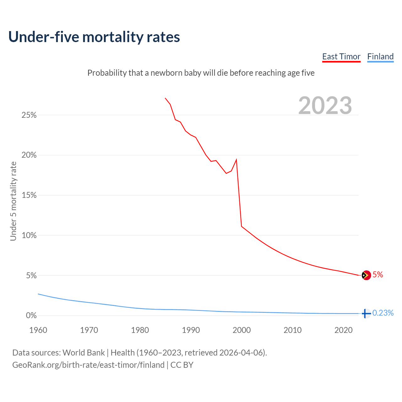 The chance that a newborn baby will die before reaching age five is 5% in East Timor and 0.23% in Finland. Above is a chart with historical data on under-five mortality rates.