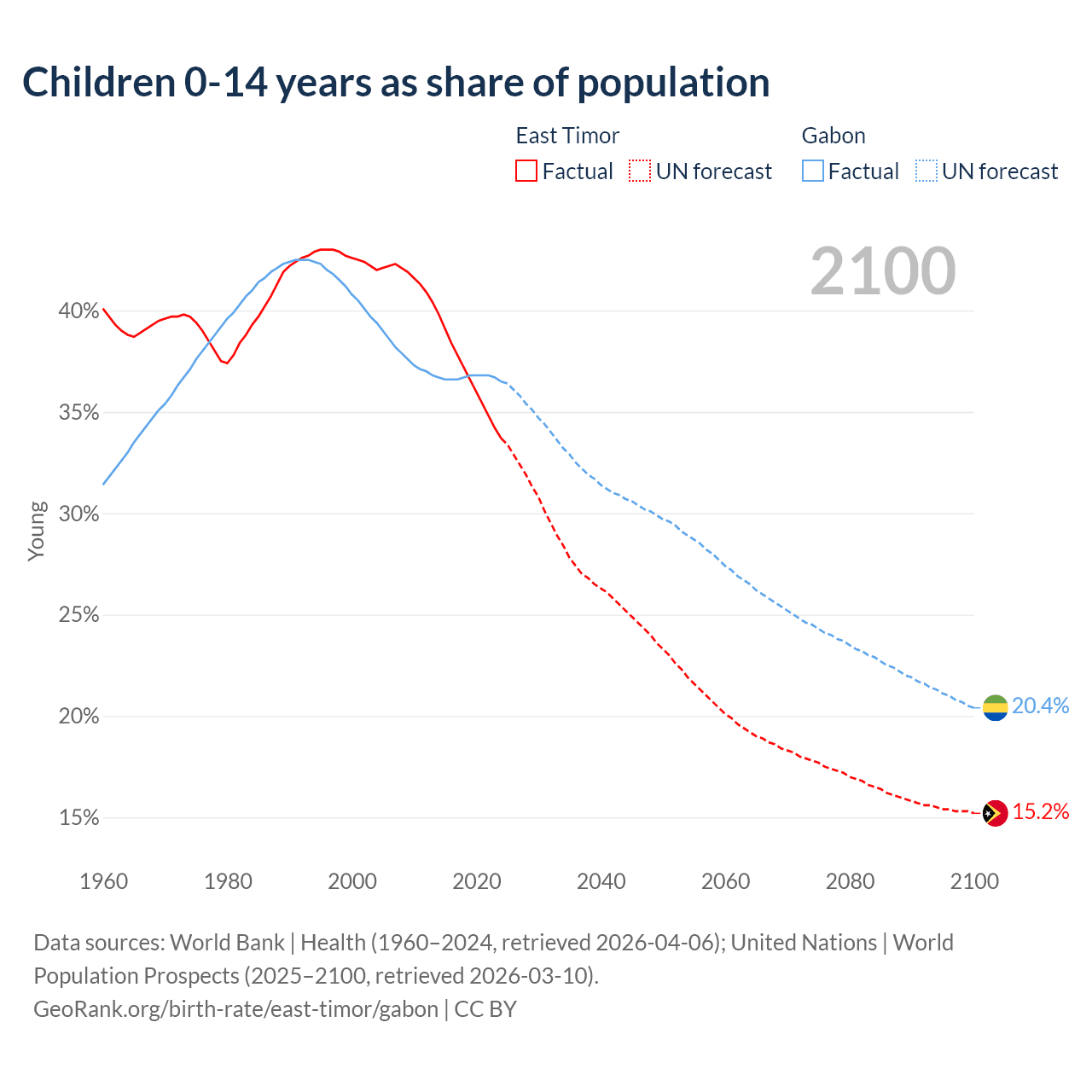 According to the latest available data on birth rates, the fertility rate in East Timor was 2.71 children per woman in 2023, compared to 3.65 in Gabon in 2023. The replacement level is considered to be 2.1 children per woman.