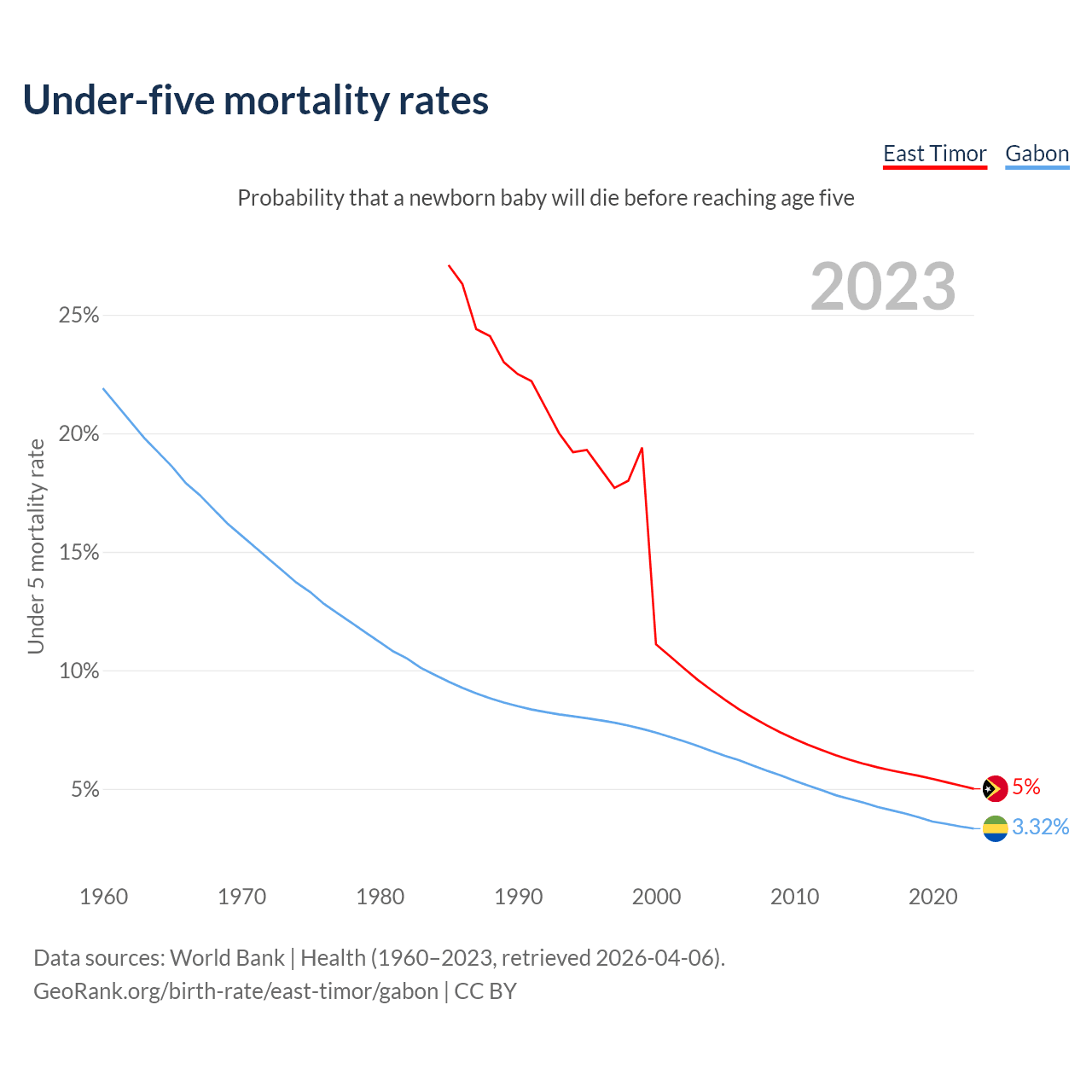 The chance that a newborn baby will die before reaching age five is 5% in East Timor and 3.32% in Gabon. Above is a chart with historical data on under-five mortality rates.