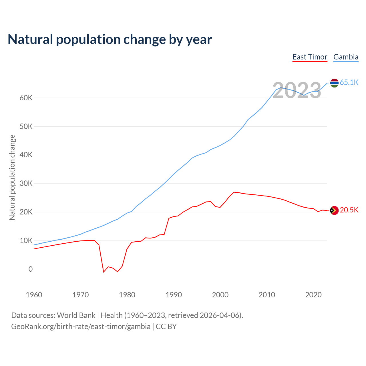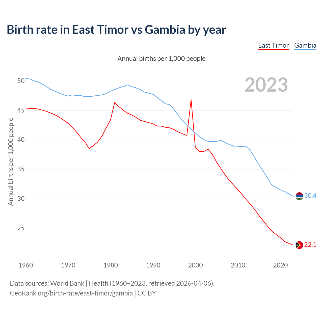 East Timor has an annual birth rate of 22.1 births per 1,000 people, compared to 30.4 for the Gambia. The average number of children a woman is expected to have during her lifetime — the fertility rate, is 2.71 in East Timor and 4.01 in the Gambia — 48% difference.
