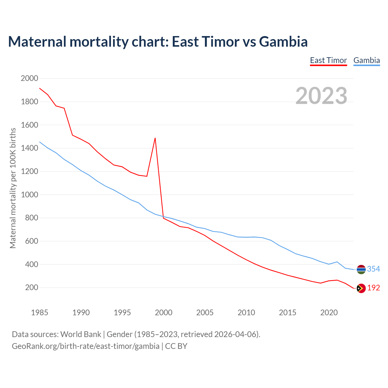 The maternal mortality rate, which is the probability of dying during childbirth or within 42 days of pregnancy termination, is 192 deaths per 100,000 live births in East Timor, compared to 354 deaths in the Gambia.