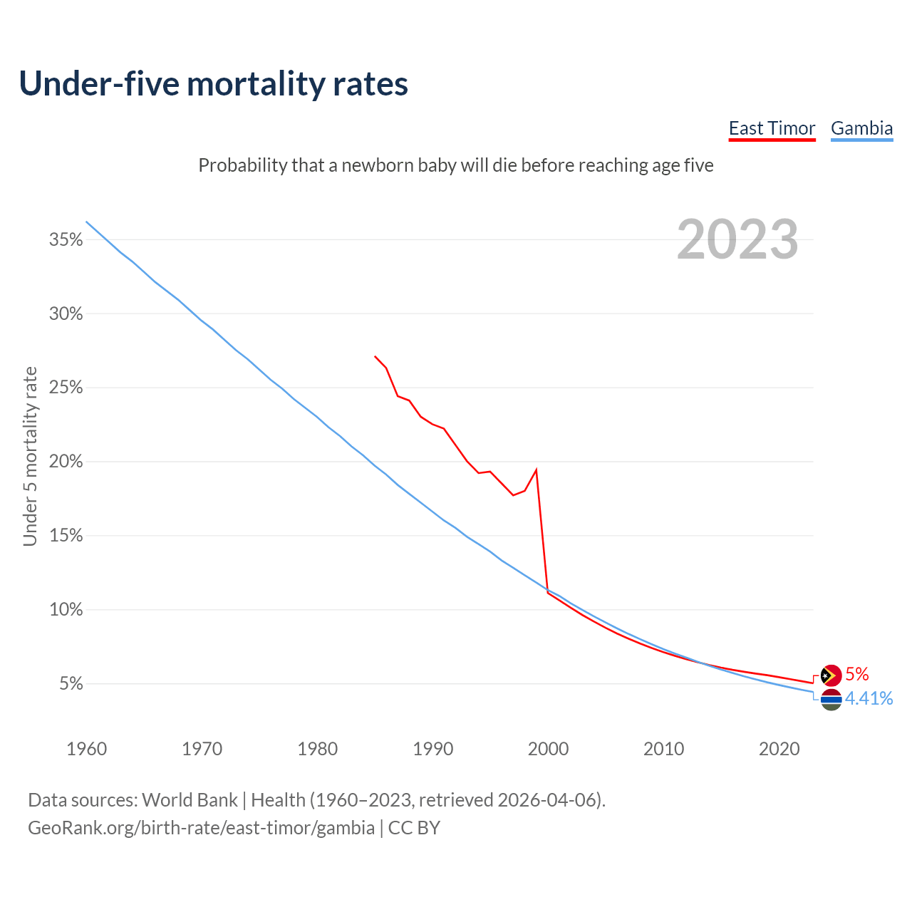The chance that a newborn baby will die before reaching age five is 5% in East Timor and 4.41% in the Gambia. Above is a chart with historical data on under-five mortality rates.