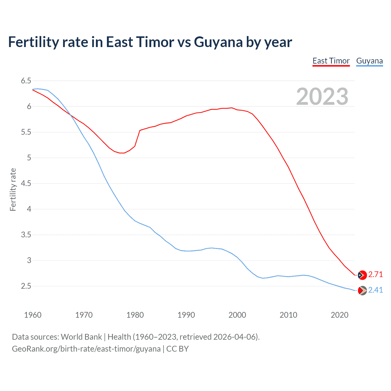 1960 vs 2023, the fertility rate has decreased by 57.2% in East Timor and by 61.9% in Guyana — in 1960, it was 6.32 and 6.33, respectively.