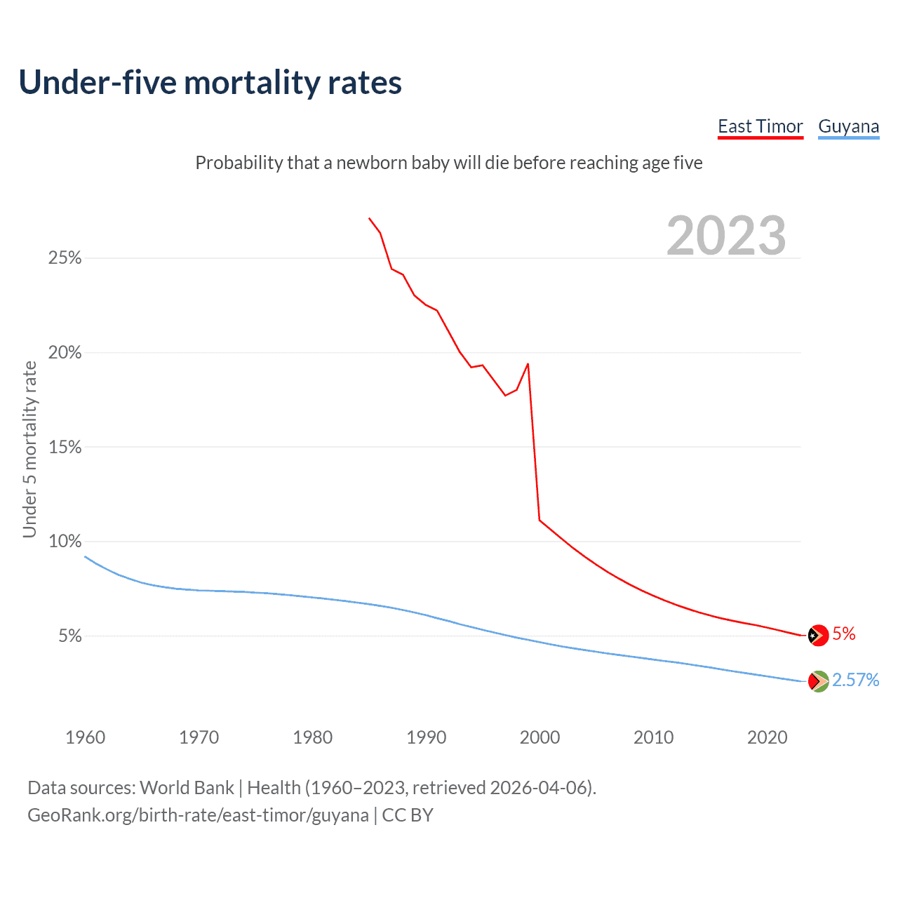 The chance that a newborn baby will die before reaching age five is 5% in East Timor and 2.57% in Guyana. Above is a chart with historical data on under-five mortality rates.