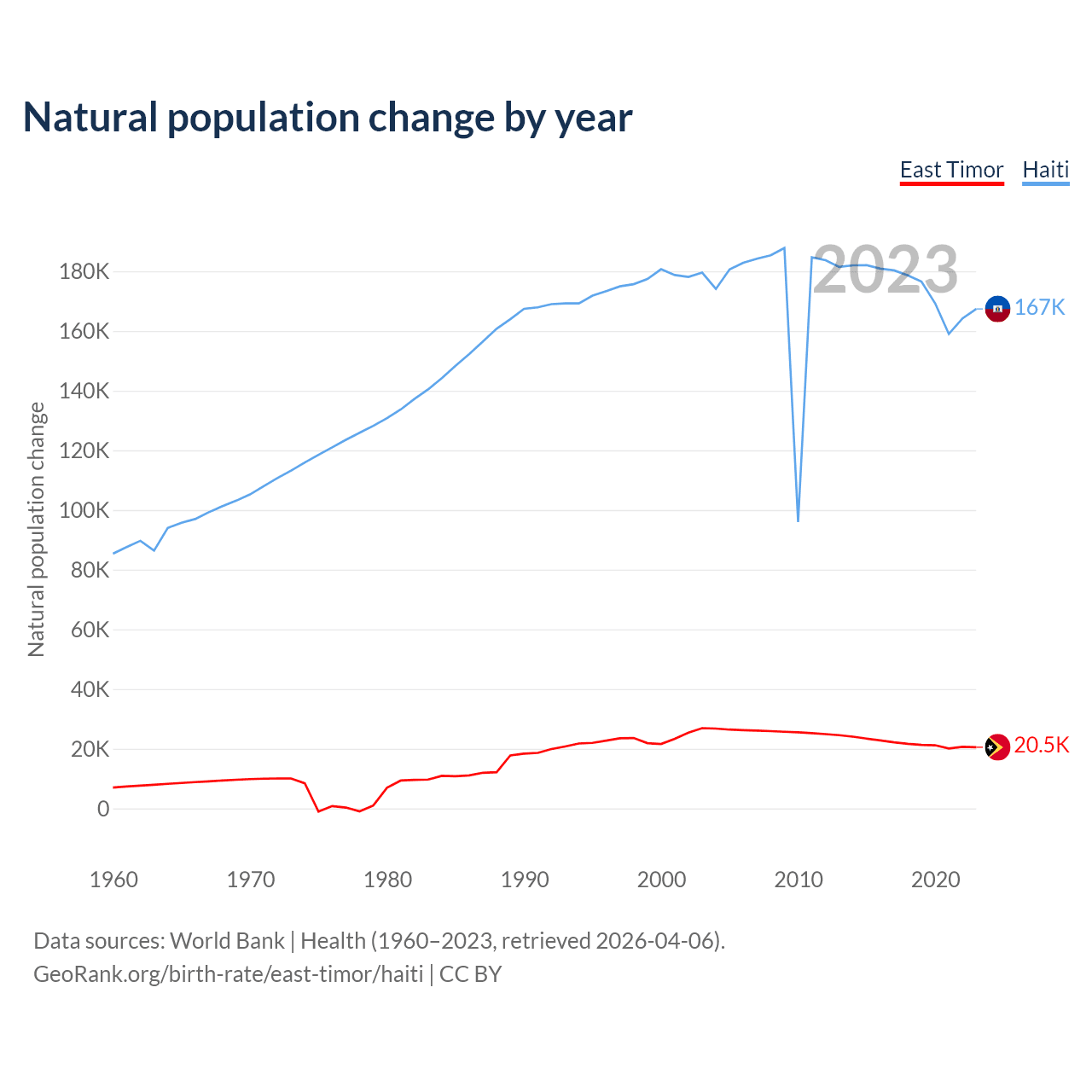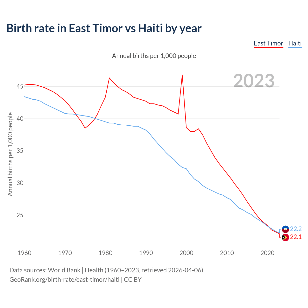 East Timor has an annual birth rate of 22.1 births per 1,000 people, compared to 22.2 for Haiti. The average number of children a woman is expected to have during her lifetime — the fertility rate, is 2.71 in East Timor and 2.66 in Haiti — 1.88% difference.