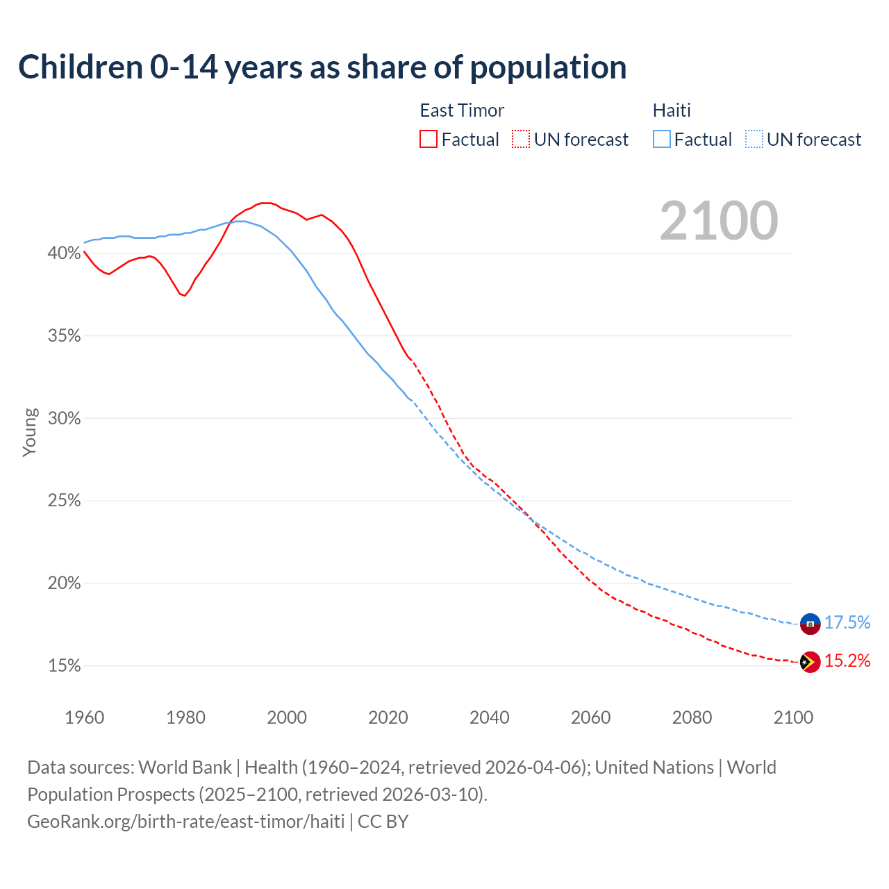 According to the latest available data on birth rates, the fertility rate in East Timor was 2.71 children per woman in 2023, compared to 2.66 in Haiti in 2023. The replacement level is considered to be 2.1 children per woman.