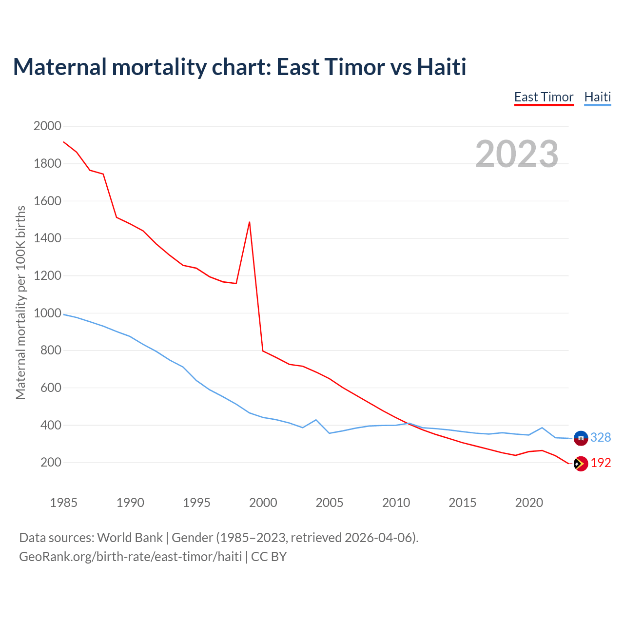The maternal mortality rate, which is the probability of dying during childbirth or within 42 days of pregnancy termination, is 192 deaths per 100,000 live births in East Timor, compared to 328 deaths in Haiti.