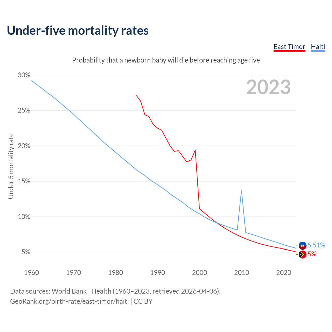 The chance that a newborn baby will die before reaching age five is 5% in East Timor and 5.51% in Haiti. Above is a chart with historical data on under-five mortality rates.