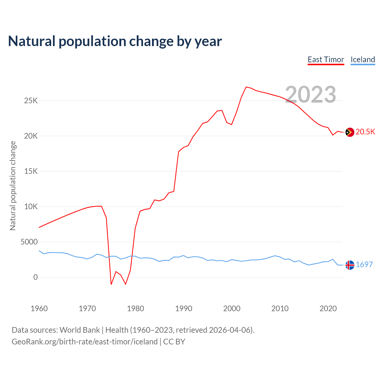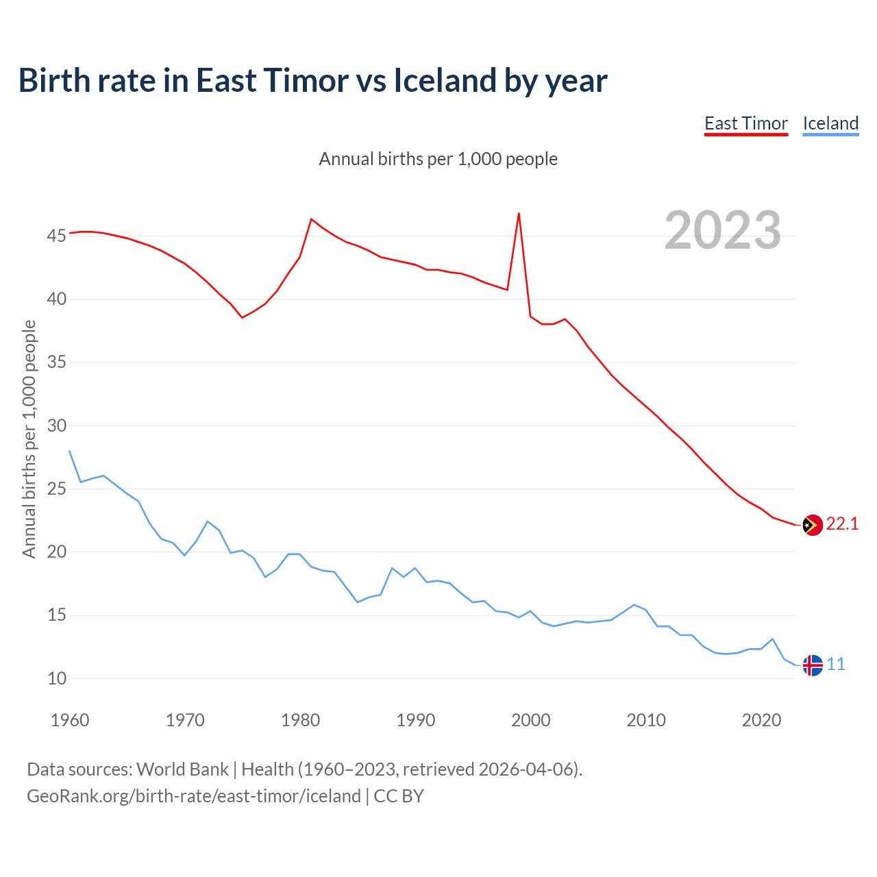 East Timor has an annual birth rate of 22.1 births per 1,000 people, compared to 11 for Iceland. The average number of children a woman is expected to have during her lifetime — the fertility rate, is 2.71 in East Timor and 1.59 in Iceland — 41.3% difference.