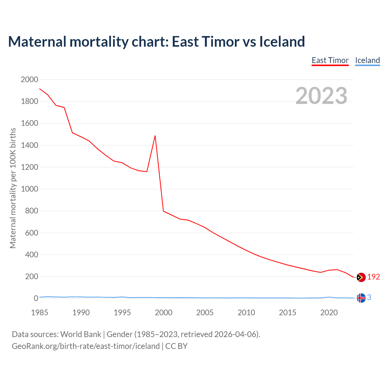 The maternal mortality rate, which is the probability of dying during childbirth or within 42 days of pregnancy termination, is 192 deaths per 100,000 live births in East Timor, compared to 3 deaths in Iceland.