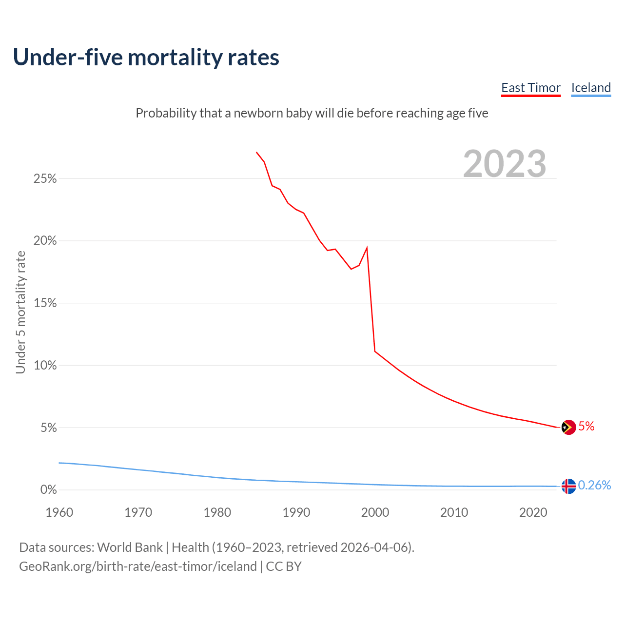 The chance that a newborn baby will die before reaching age five is 5% in East Timor and 0.26% in Iceland. Above is a chart with historical data on under-five mortality rates.