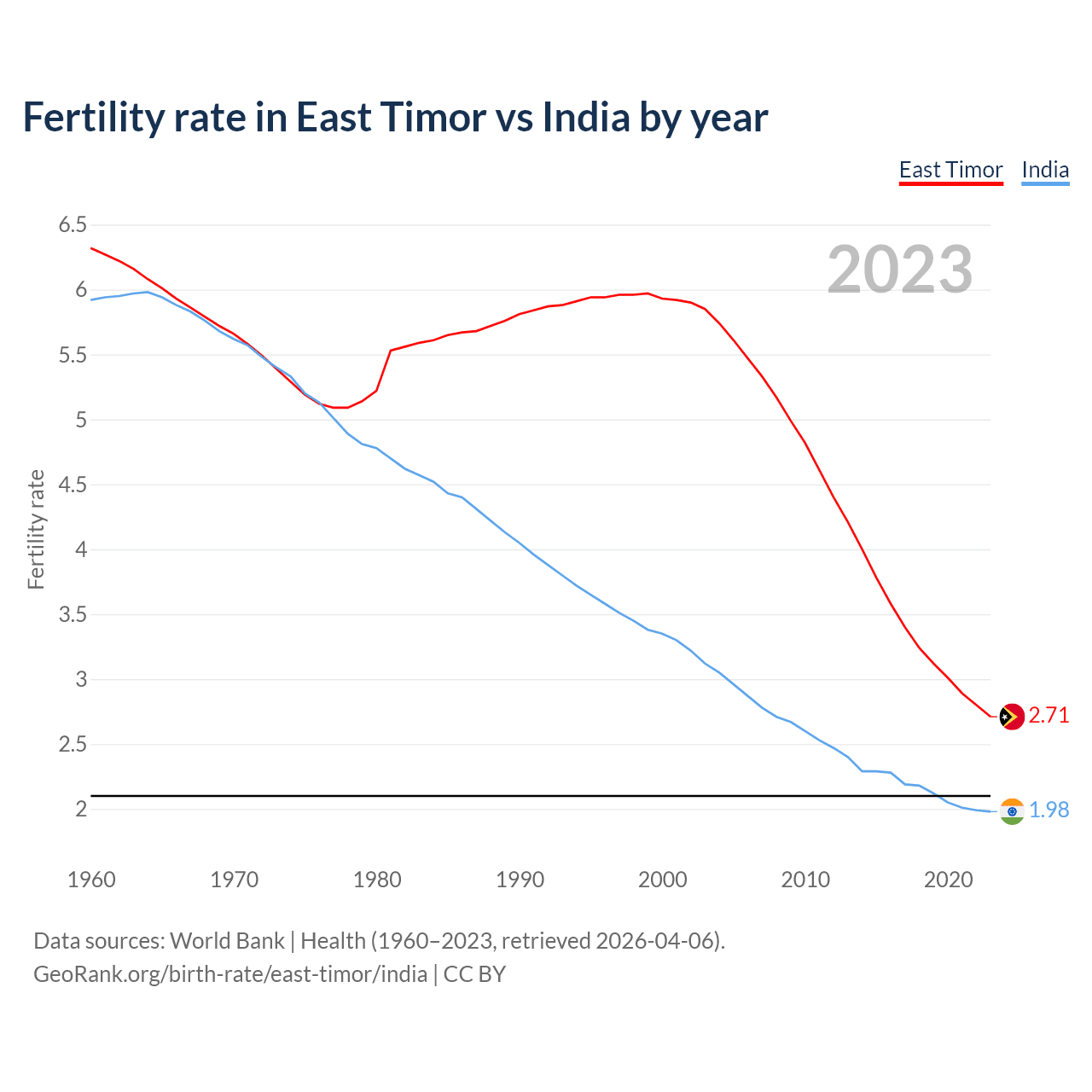 1960 vs 2023, the fertility rate has decreased by 57.2% in East Timor and by 66.6% in India — in 1960, it was 6.32 and 5.92, respectively.