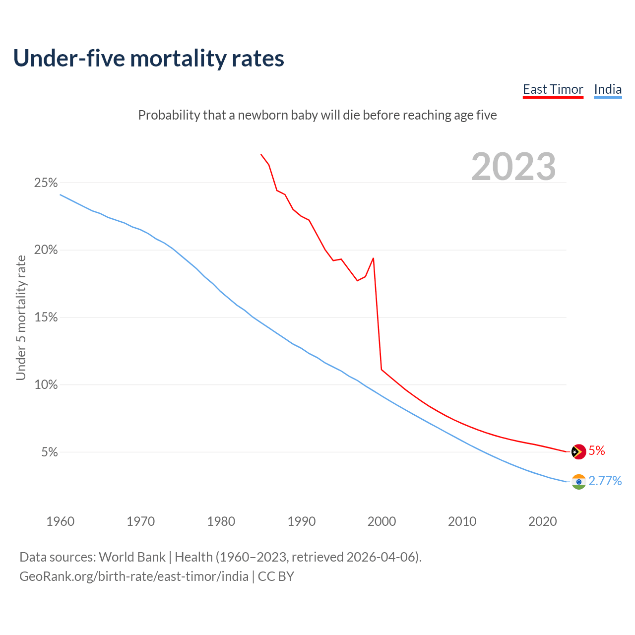 The chance that a newborn baby will die before reaching age five is 5% in East Timor and 2.77% in India. Above is a chart with historical data on under-five mortality rates.