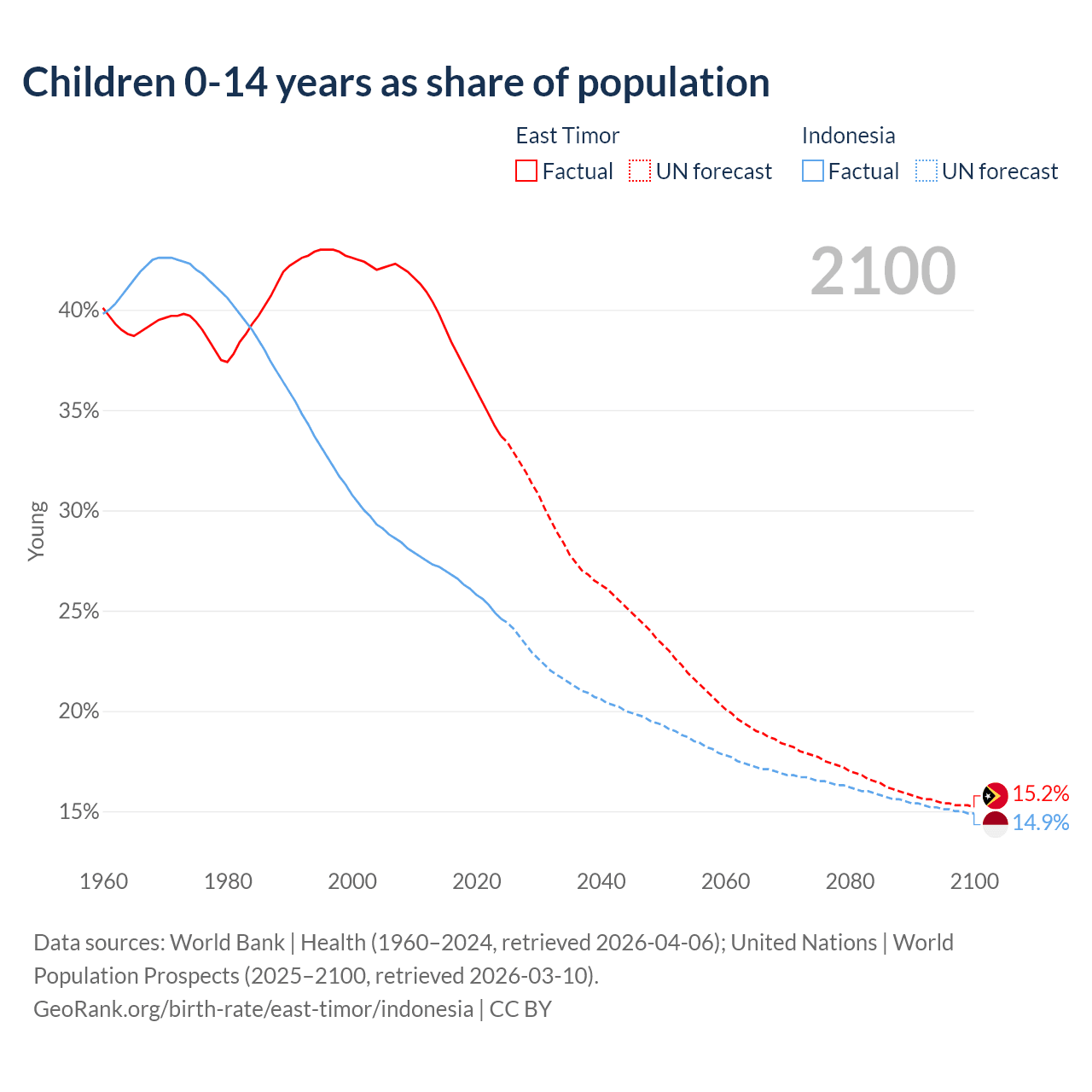 1960 vs 2023, the fertility rate has decreased by 57.2% in East Timor and by 61.4% in Indonesia — in 1960, it was 6.32 and 5.51, respectively.
