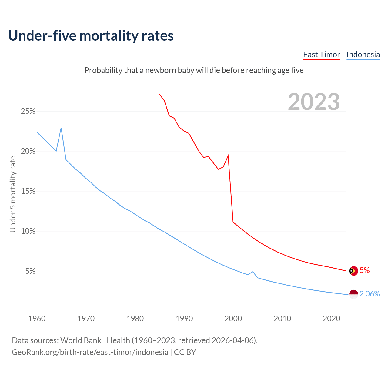 The chance that a newborn baby will die before reaching age five is 5% in East Timor and 2.06% in Indonesia. Above is a chart with historical data on under-five mortality rates.