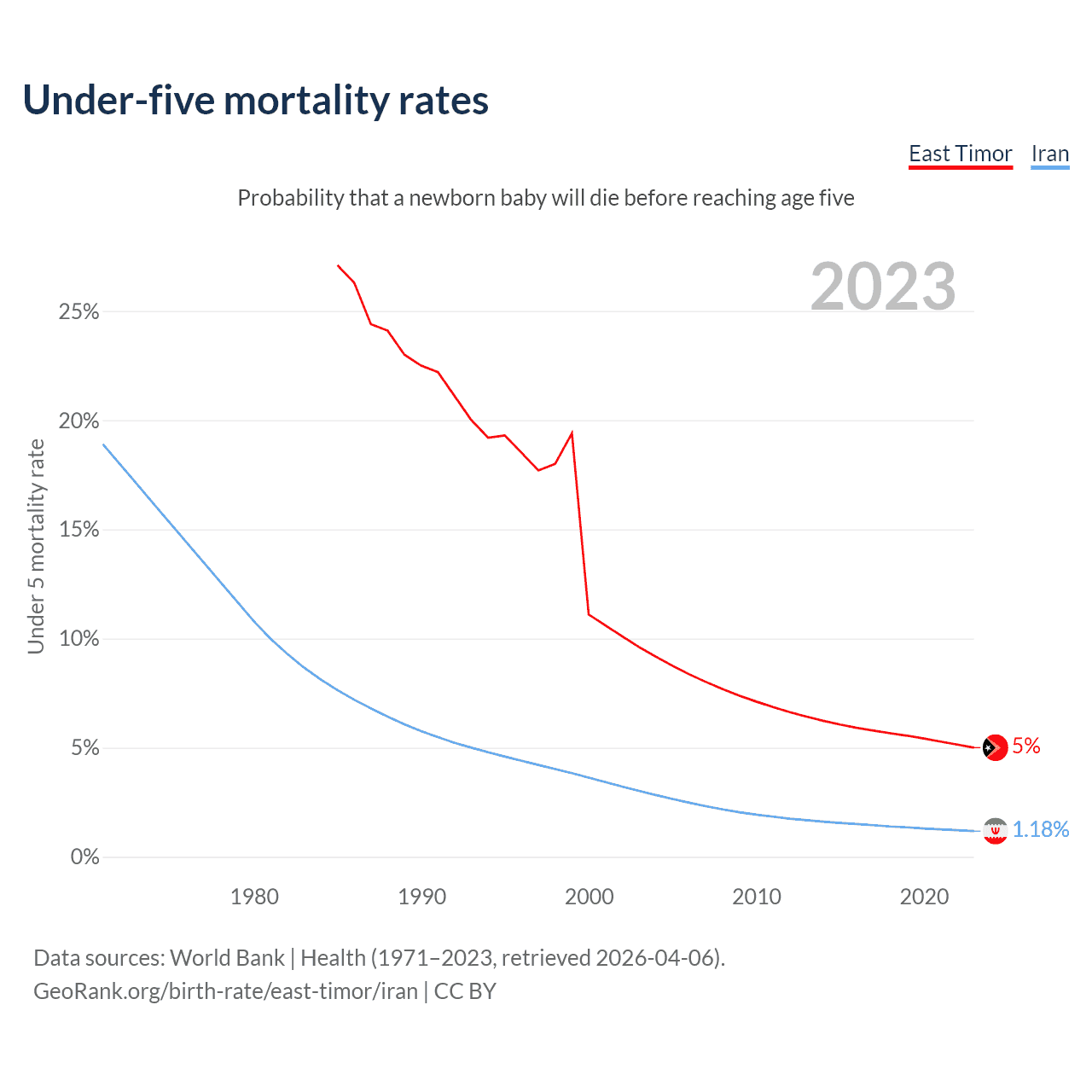 The chance that a newborn baby will die before reaching age five is 5% in East Timor and 1.18% in Iran. Above is a chart with historical data on under-five mortality rates.