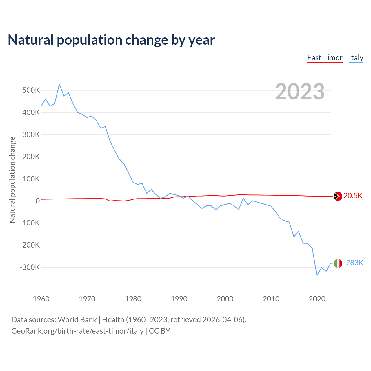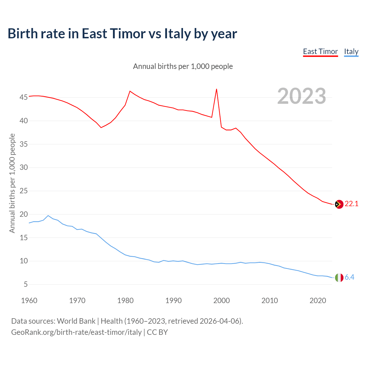 East Timor has an annual birth rate of 22.1 births per 1,000 people, compared to 6.4 for Italy. The average number of children a woman is expected to have during her lifetime — the fertility rate, is 2.71 in East Timor and 1.2 in Italy — 55.7% difference.