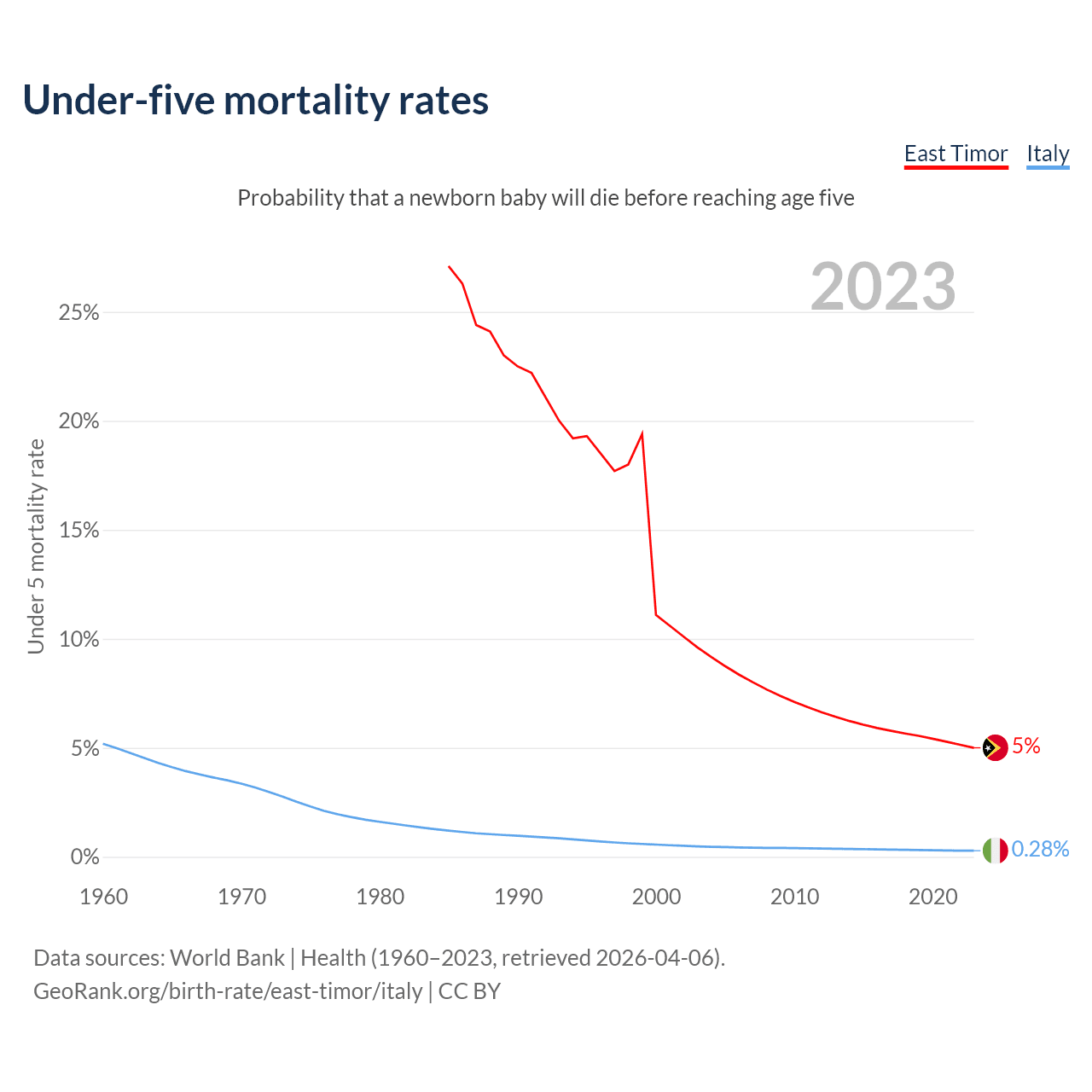 The chance that a newborn baby will die before reaching age five is 5% in East Timor and 0.28% in Italy. Above is a chart with historical data on under-five mortality rates.