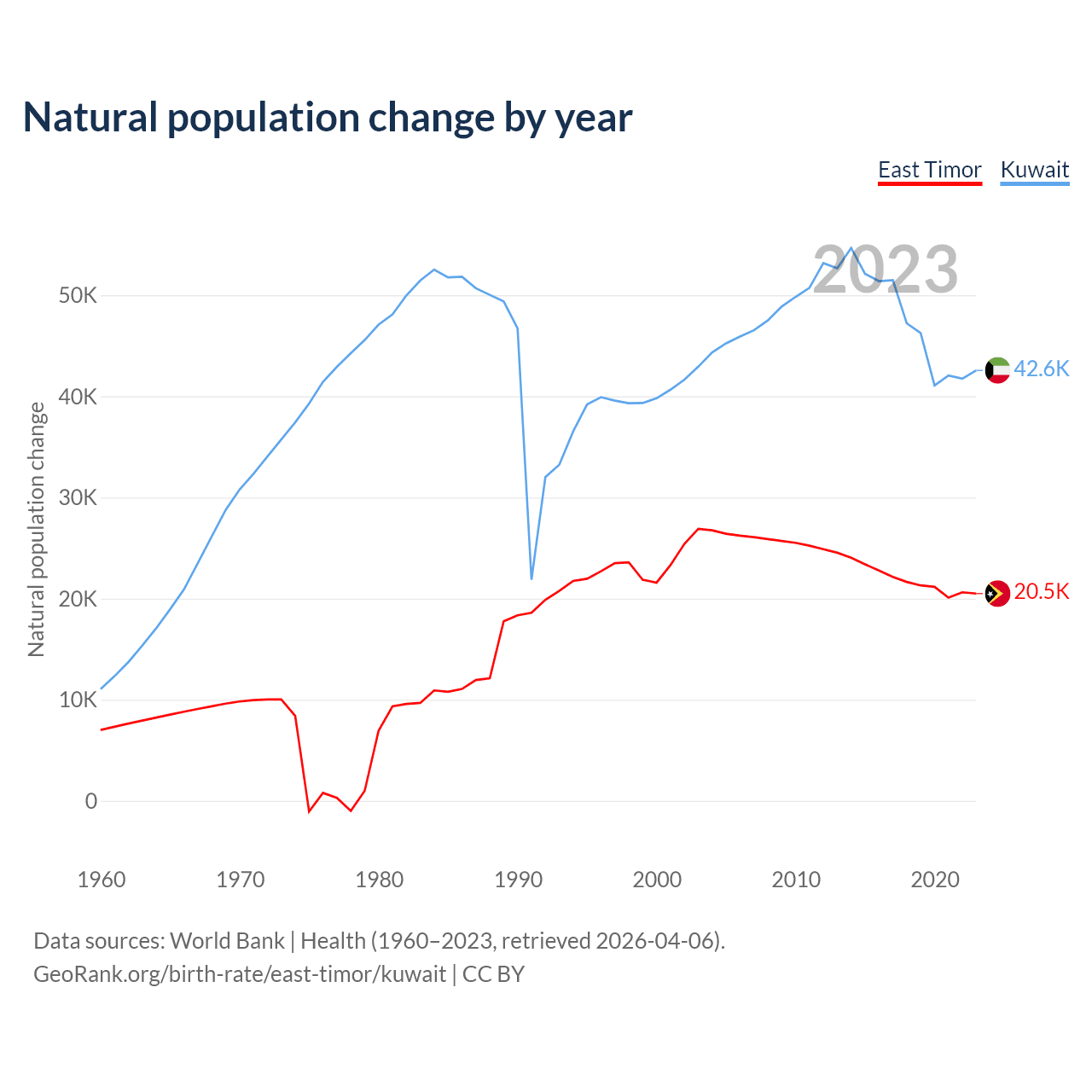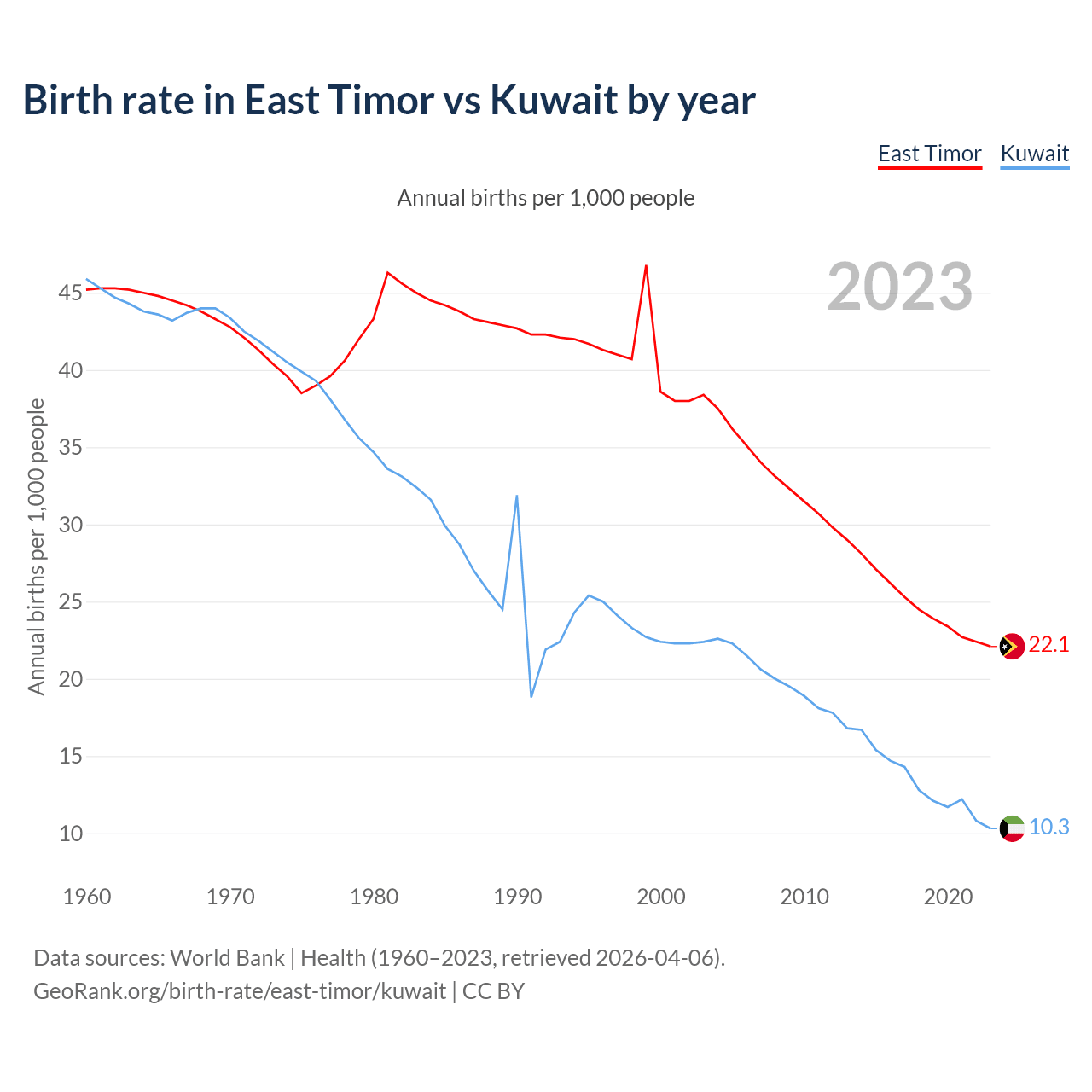East Timor has an annual birth rate of 22.1 births per 1,000 people, compared to 10.3 for Kuwait. The average number of children a woman is expected to have during her lifetime — the fertility rate, is 2.71 in East Timor and 1.52 in Kuwait — 43.7% difference.