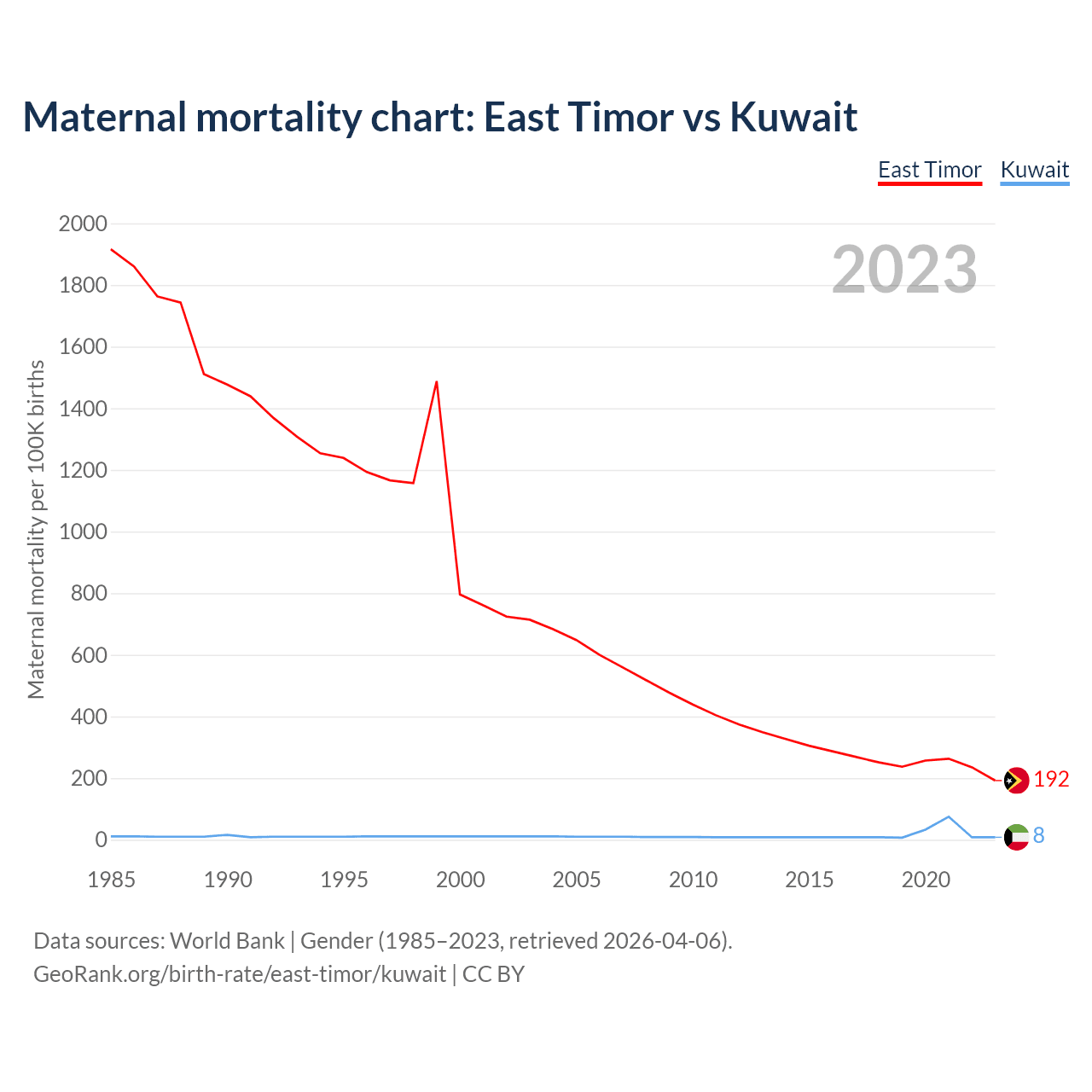 The maternal mortality rate, which is the probability of dying during childbirth or within 42 days of pregnancy termination, is 192 deaths per 100,000 live births in East Timor, compared to 8 deaths in Kuwait.