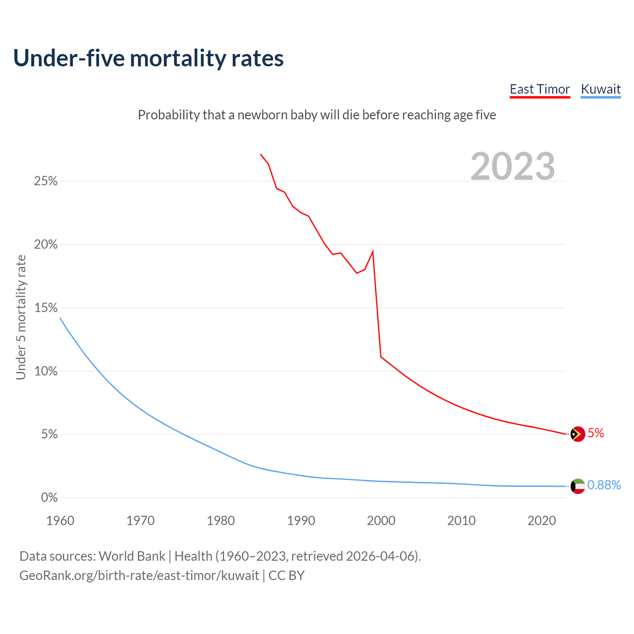 The chance that a newborn baby will die before reaching age five is 5% in East Timor and 0.88% in Kuwait. Above is a chart with historical data on under-five mortality rates.