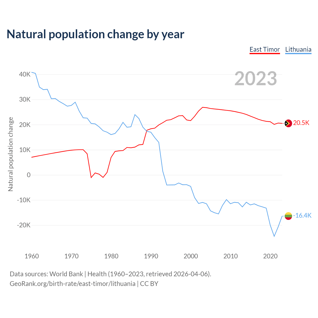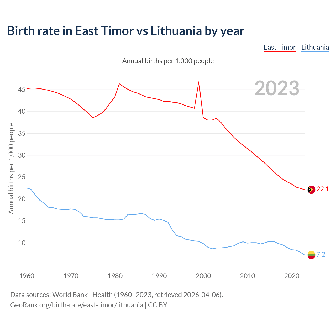 East Timor has an annual birth rate of 22.1 births per 1,000 people, compared to 7.2 for Lithuania. The average number of children a woman is expected to have during her lifetime — the fertility rate, is 2.71 in East Timor and 1.18 in Lithuania — 56.4% difference.