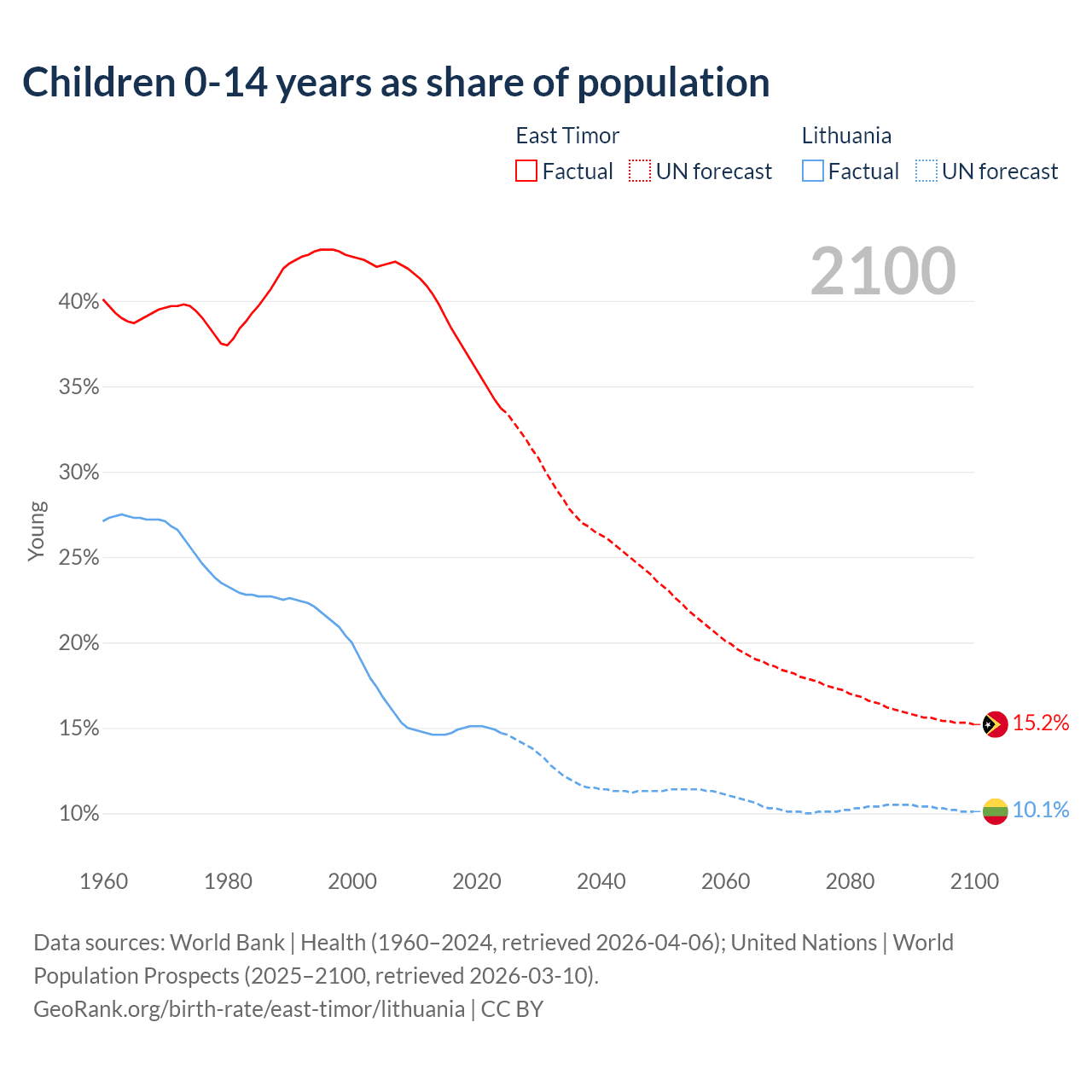 According to the latest available data on birth rates, the fertility rate in East Timor was 2.71 children per woman in 2023, compared to 1.18 in Lithuania in 2023. The replacement level is considered to be 2.1 children per woman.