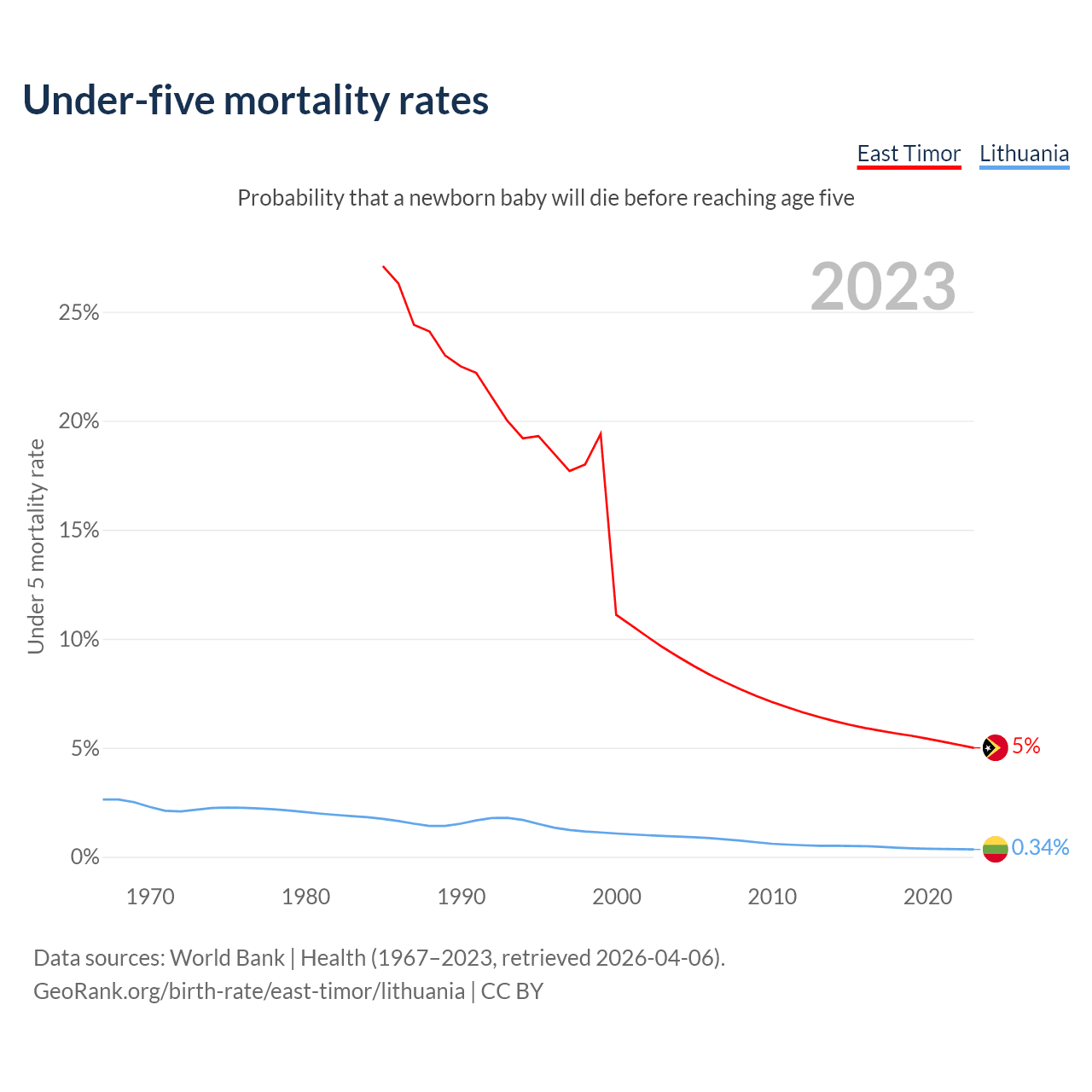 The chance that a newborn baby will die before reaching age five is 5% in East Timor and 0.34% in Lithuania. Above is a chart with historical data on under-five mortality rates.