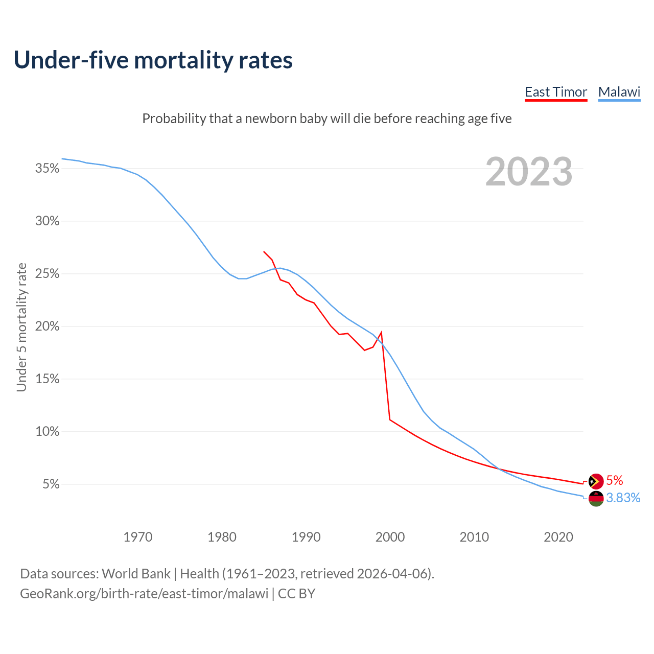 The chance that a newborn baby will die before reaching age five is 5% in East Timor and 3.83% in Malawi. Above is a chart with historical data on under-five mortality rates.