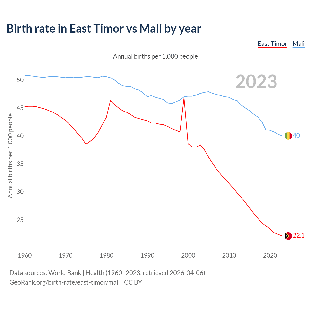 East Timor has an annual birth rate of 22.1 births per 1,000 people, compared to 40 for Mali. The average number of children a woman is expected to have during her lifetime — the fertility rate, is 2.71 in East Timor and 5.61 in Mali — 107.4% difference.