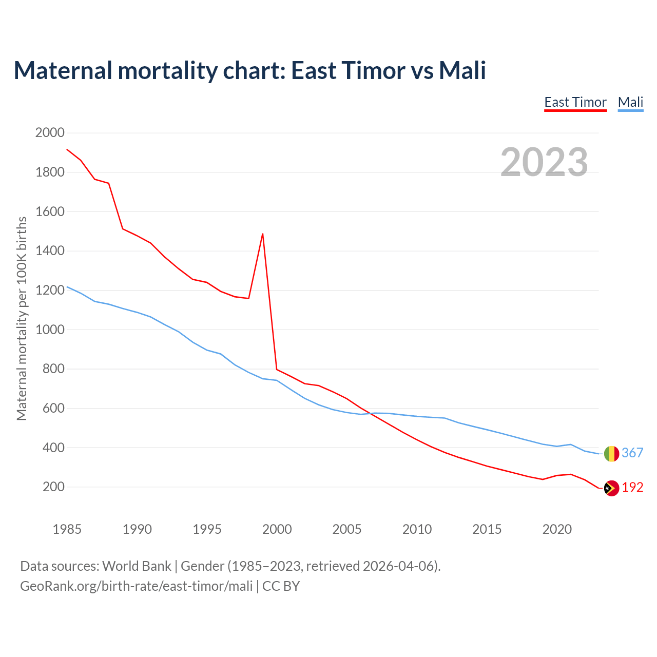 The maternal mortality rate, which is the probability of dying during childbirth or within 42 days of pregnancy termination, is 192 deaths per 100,000 live births in East Timor, compared to 367 deaths in Mali.