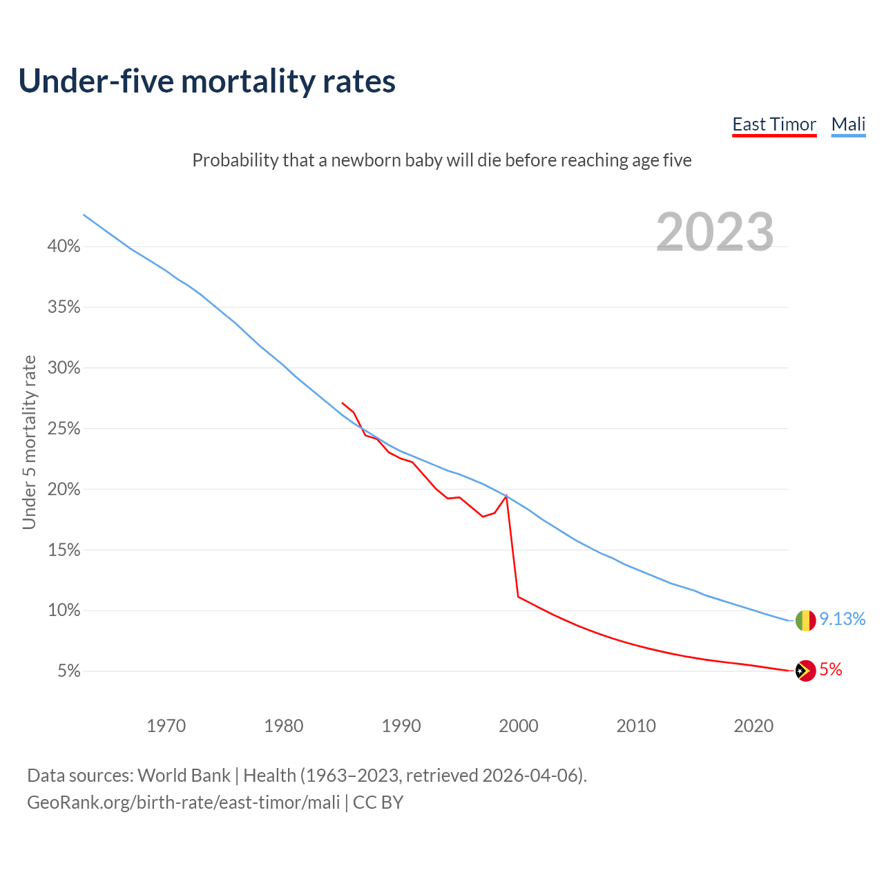 The chance that a newborn baby will die before reaching age five is 5% in East Timor and 9.13% in Mali. Above is a chart with historical data on under-five mortality rates.
