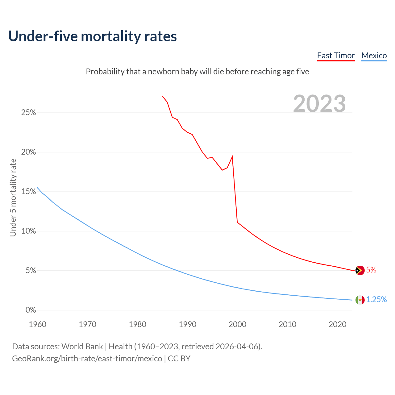 The chance that a newborn baby will die before reaching age five is 5% in East Timor and 1.25% in Mexico. Above is a chart with historical data on under-five mortality rates.