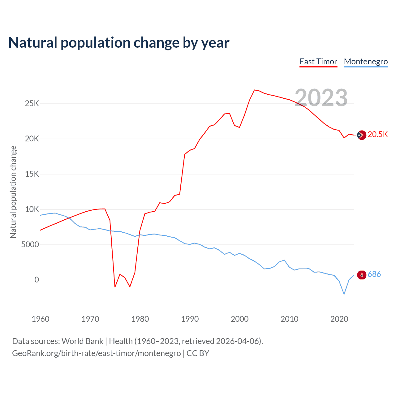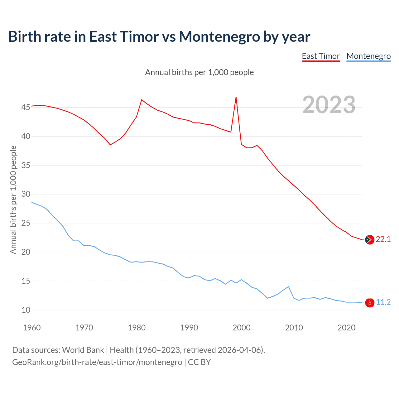 East Timor has an annual birth rate of 22.1 births per 1,000 people, compared to 11.2 for Montenegro. The average number of children a woman is expected to have during her lifetime — the fertility rate, is 2.71 in East Timor and 1.74 in Montenegro — 35.7% difference.