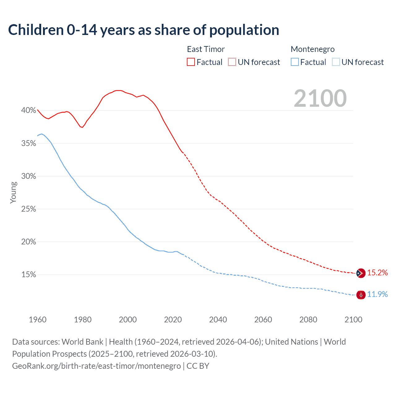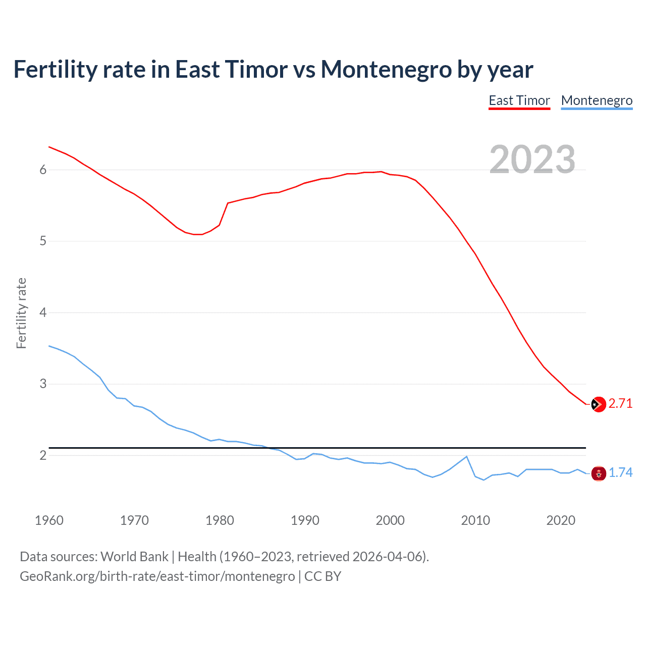 According to the latest available data on birth rates, the fertility rate in East Timor was 2.71 children per woman in 2023, compared to 1.74 in Montenegro in 2023. The replacement level is considered to be 2.1 children per woman.